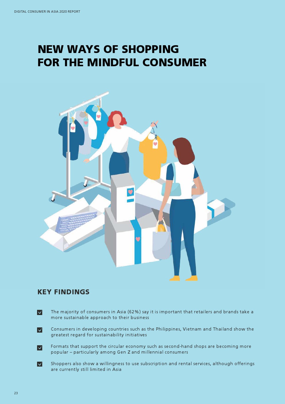 大多数亚洲消费者(62%)表示,零售商和品牌对其业务采取更可持续的方式非常重要。菲律宾、越南和泰国等发展中国家的消费者最重视可持续发展举措。支持循环经济的业态,比如二手商店,正变得越来越流行,尤其是在Z世代和千禧一代的消费者中。购物者也愿意使用订阅和租赁服务,尽管目前在亚洲提供的这类服务仍然有限。