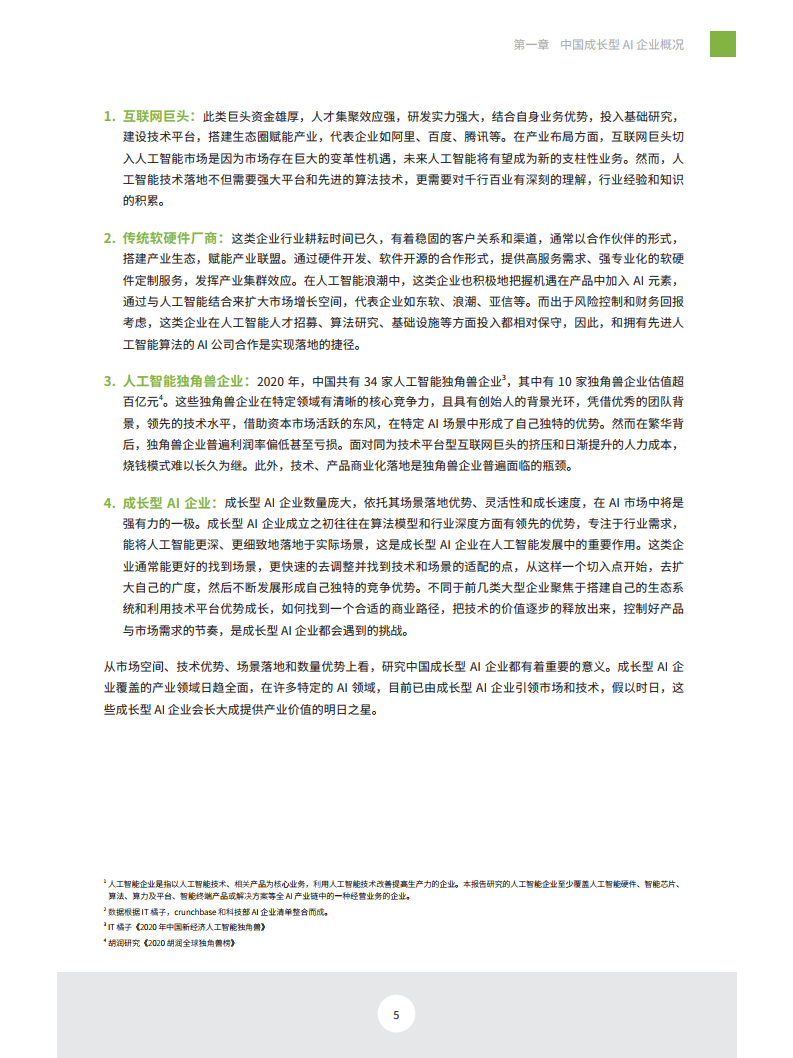 十四五规划将人工智能列为前沿科技领域的最高优先级,必将推动中国的人工智能产业迎来新一轮的大发展。在全球抗疫的大背景下,抗疫需求为人工智能提供了应用落地的契机和试验场,AI 在医疗、城市治理、工业、服务业等领域迅速发展,充分展现了其应用潜力。与此同时,成长型 AI 企业迈向更大的舞台,通过获取投资、AI 技术与商业模式创新、加速细分场景落地等方式,成长性AI企业不断完善产业链布局,获取了更大的增长空间。