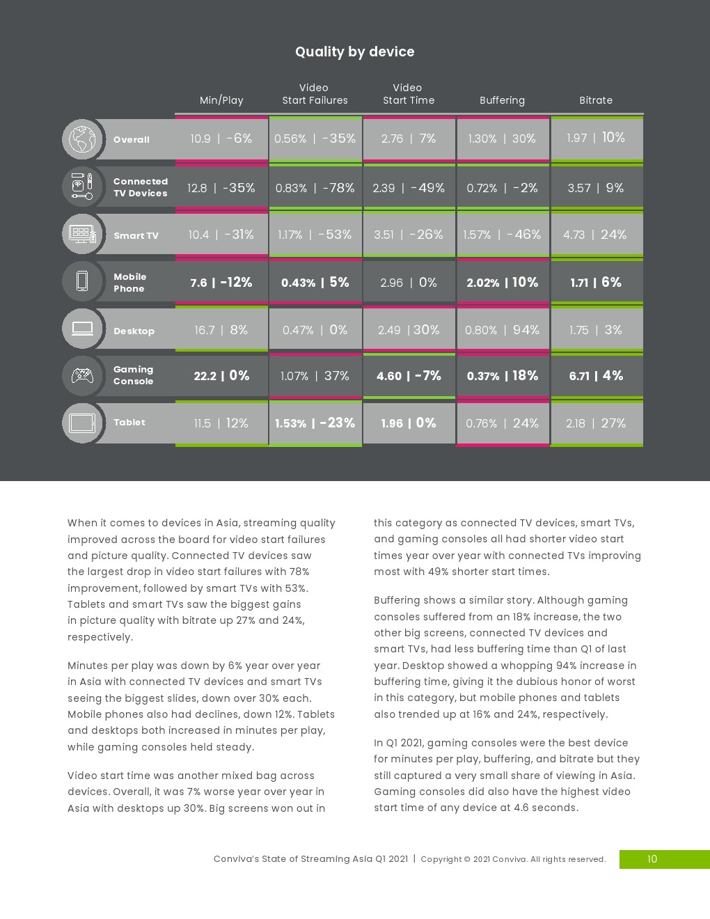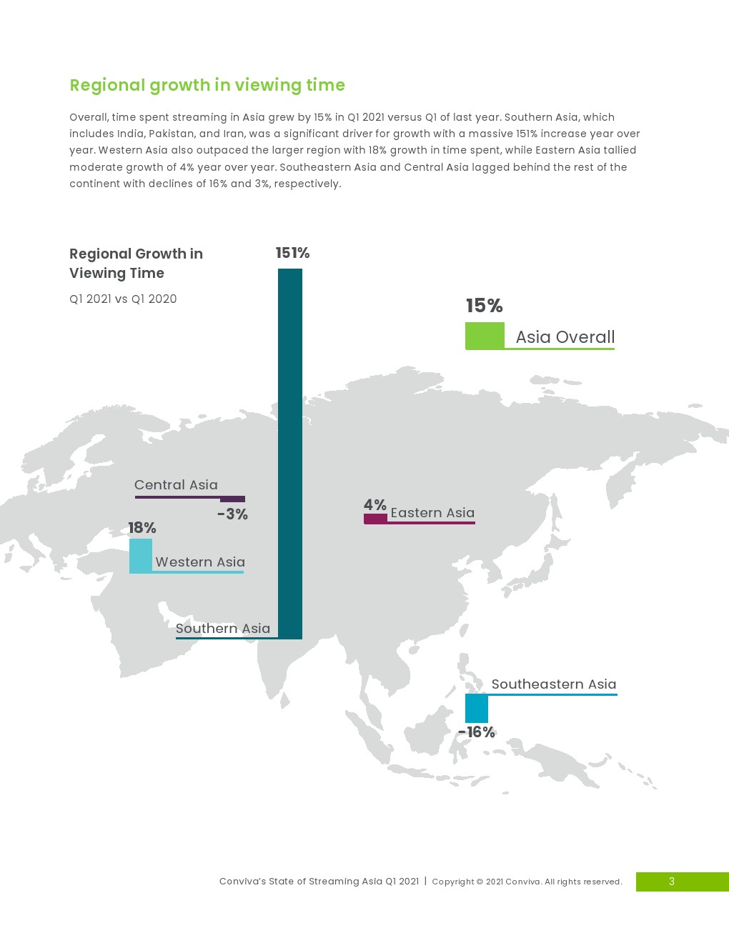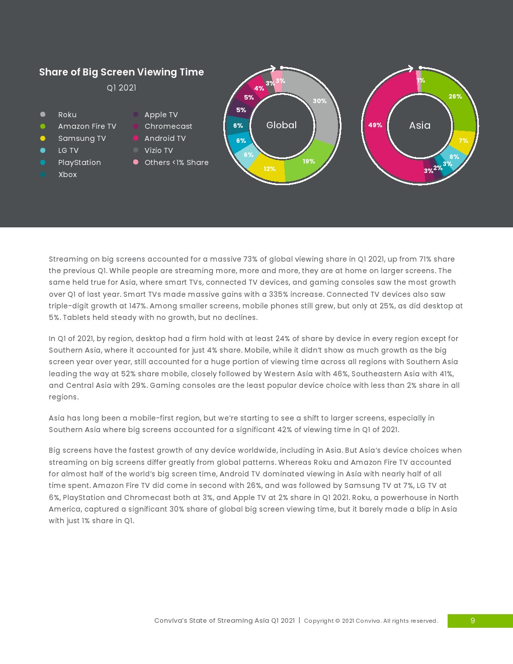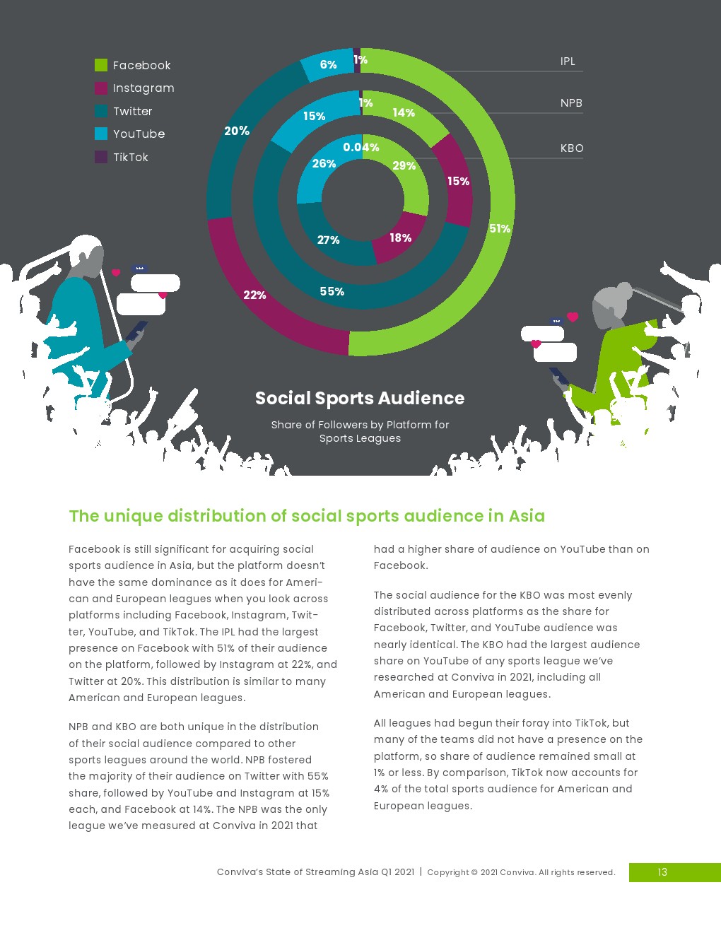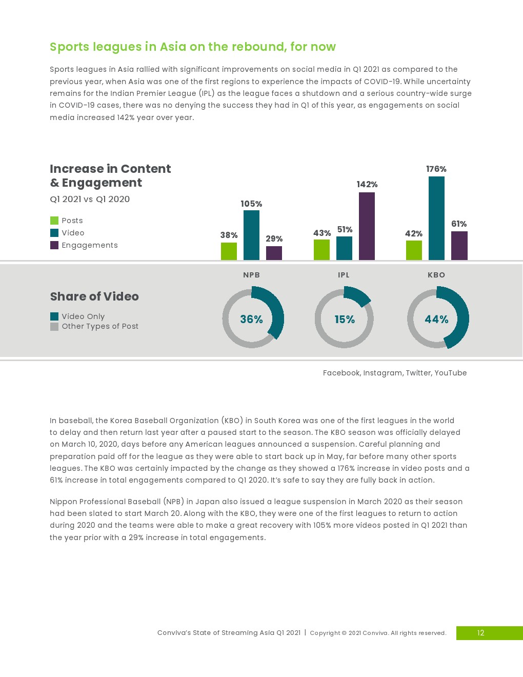 流媒体继续增长:亚洲的增长率为15%,更加温和;而全球观看时间则增长了36%,主要是由于南美、欧洲和非洲的三位数的增长率。直播不再占主导地位:点播首次在亚洲战胜了直播,观众将57%的时间用于观看点播节目,与上一季度的数字(44%)相比大幅上升。大屏幕将继续存在:虽然大屏幕吸引亚洲观众的时间历来少于全球,但亚洲的智能电视、联网电视设备和游戏机在去年第一季度增长最快。安卓系统统治亚洲的大屏幕时间:Roku和Amazon Fire电视加起来几乎占世界大屏幕收视时间的一半,而安卓在亚洲占主导地位,几乎一半的时间都花在运行这个系统的大屏幕上。亚洲体育联盟在社交媒体上反弹:2021年第一季度,亚洲体育联盟的参与度大幅提高,印度超级联赛(IPL)增长142%,韩国棒球组织(KBO)增长60%,日本职业棒球(NPB)增长29%。