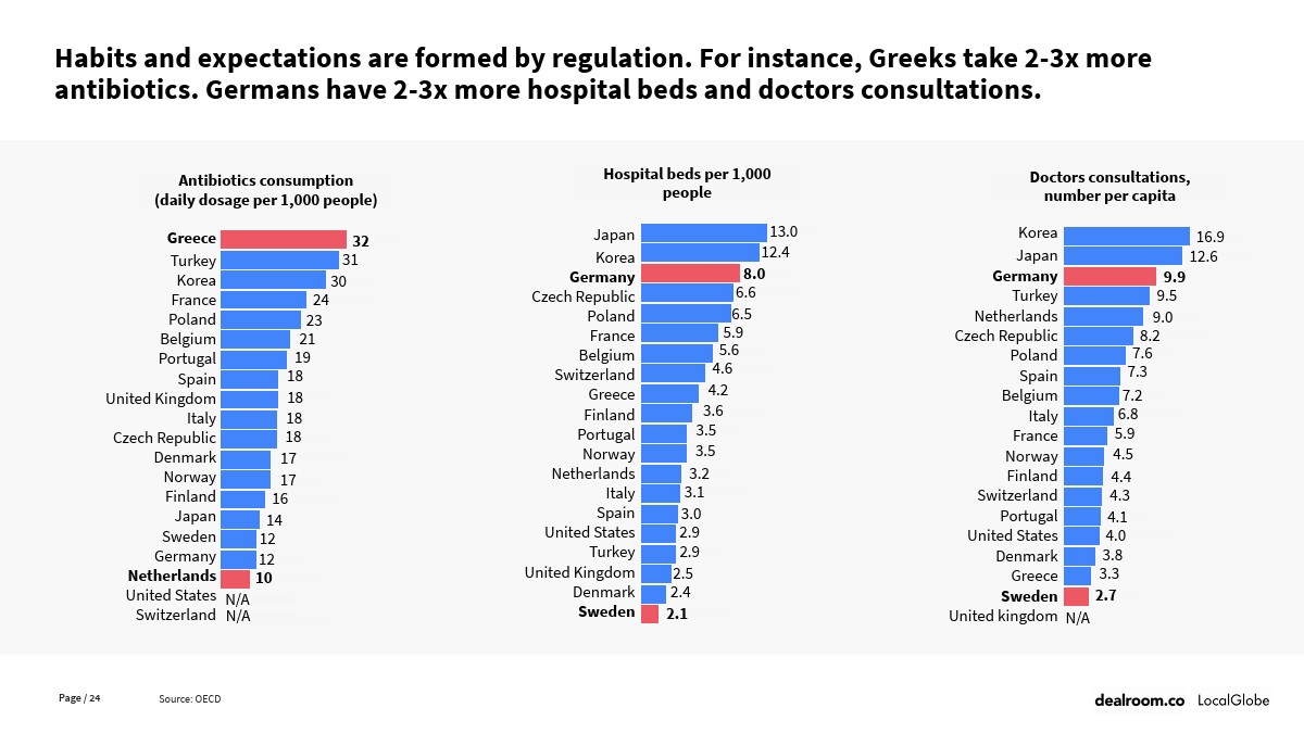 即使在一个医疗体系高度发达的地区,欧洲在医疗资源、习惯和文化方面也存在巨大的差距。希腊人服用的抗生素是荷兰人的3倍,德国人的病床数量是瑞典、丹麦或英国的3-4倍。