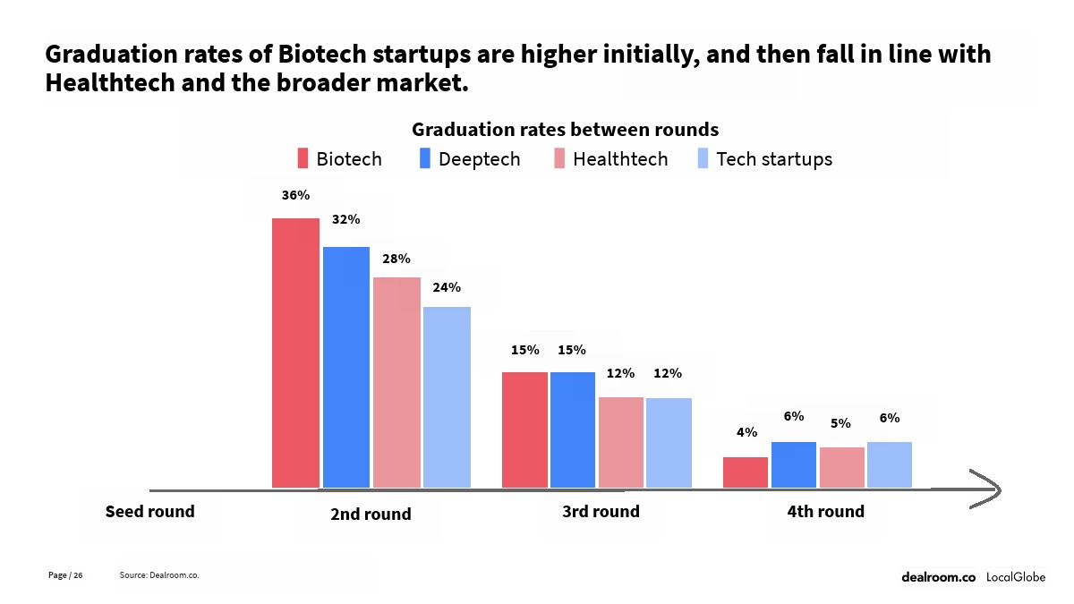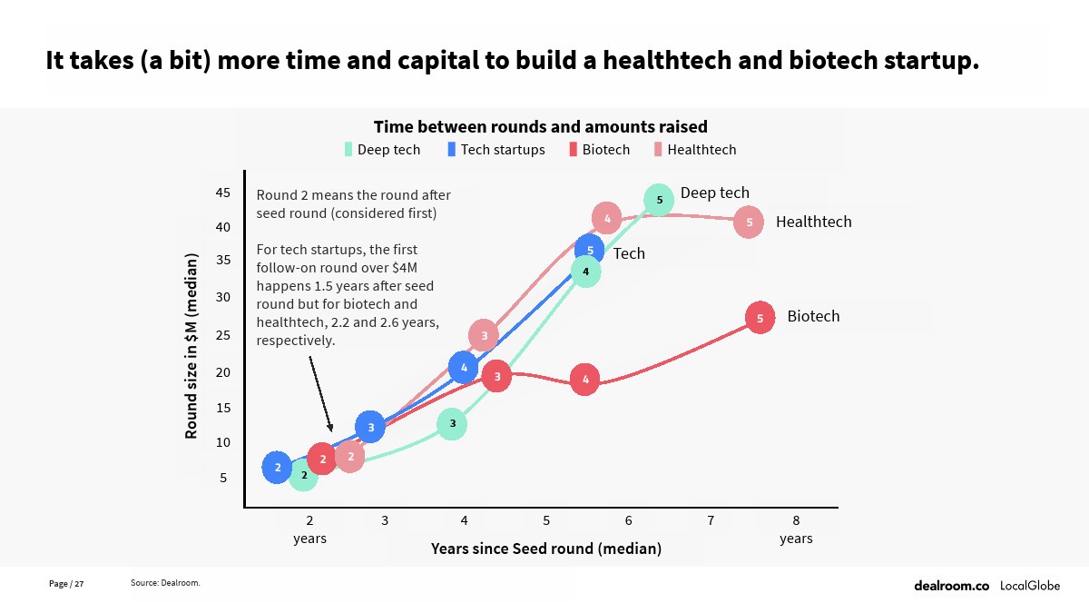 建立一个生物技术创业公司和建立一个SaaS创业公司可能有很大的不同,而且融资的过程也可能有很大的不同。与其他科技初创公司相比,生物科技初创公司筹集第二轮投资的可能性几乎是后者的1.5倍。在早期阶段,似乎需要更多的时间和资金来证明一种具有潜在科学突破性的生物技术的有效性。