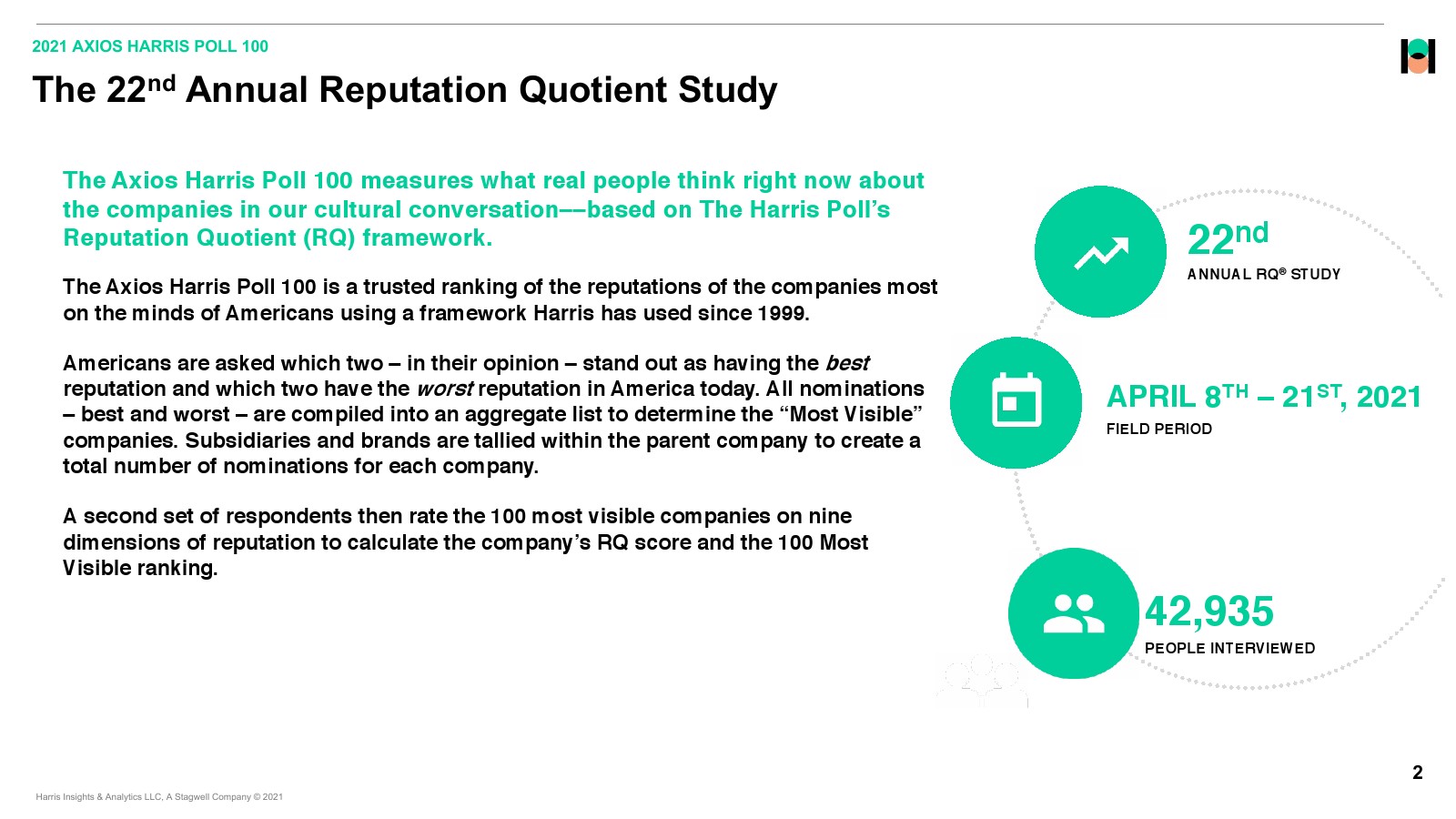 消费品行业(74%)在2020年正面声誉提升幅度最大(8个百分点),但其在正面声誉方面仍低于零售杂货店(81%);科技公司(69%)的正面声誉比去年下降了2个百分点,苹果是唯一一家声誉有所改善的科技公司(从2020年的第27名上升到第16名)。