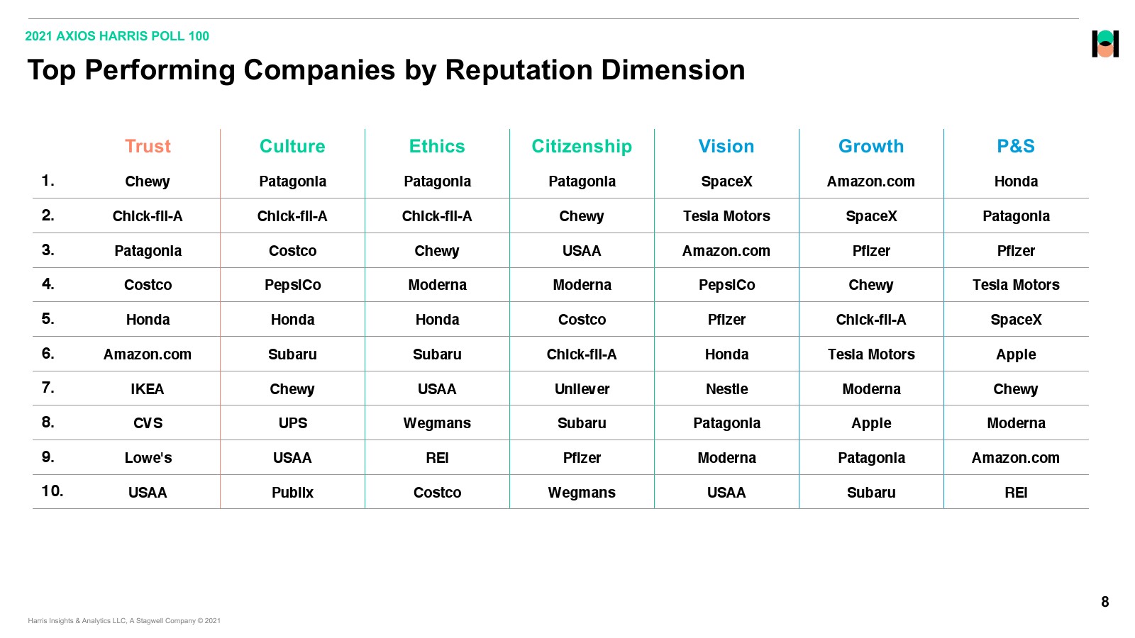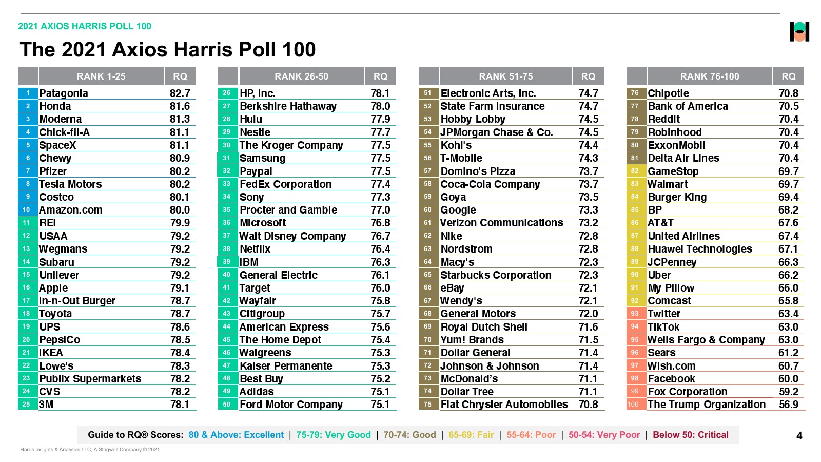 今年的榜首是Patagonia,其声誉商数为82.7。该公司在文化、道德和公民意识方面名列榜首。它也是千禧一代中表现最好的品牌。