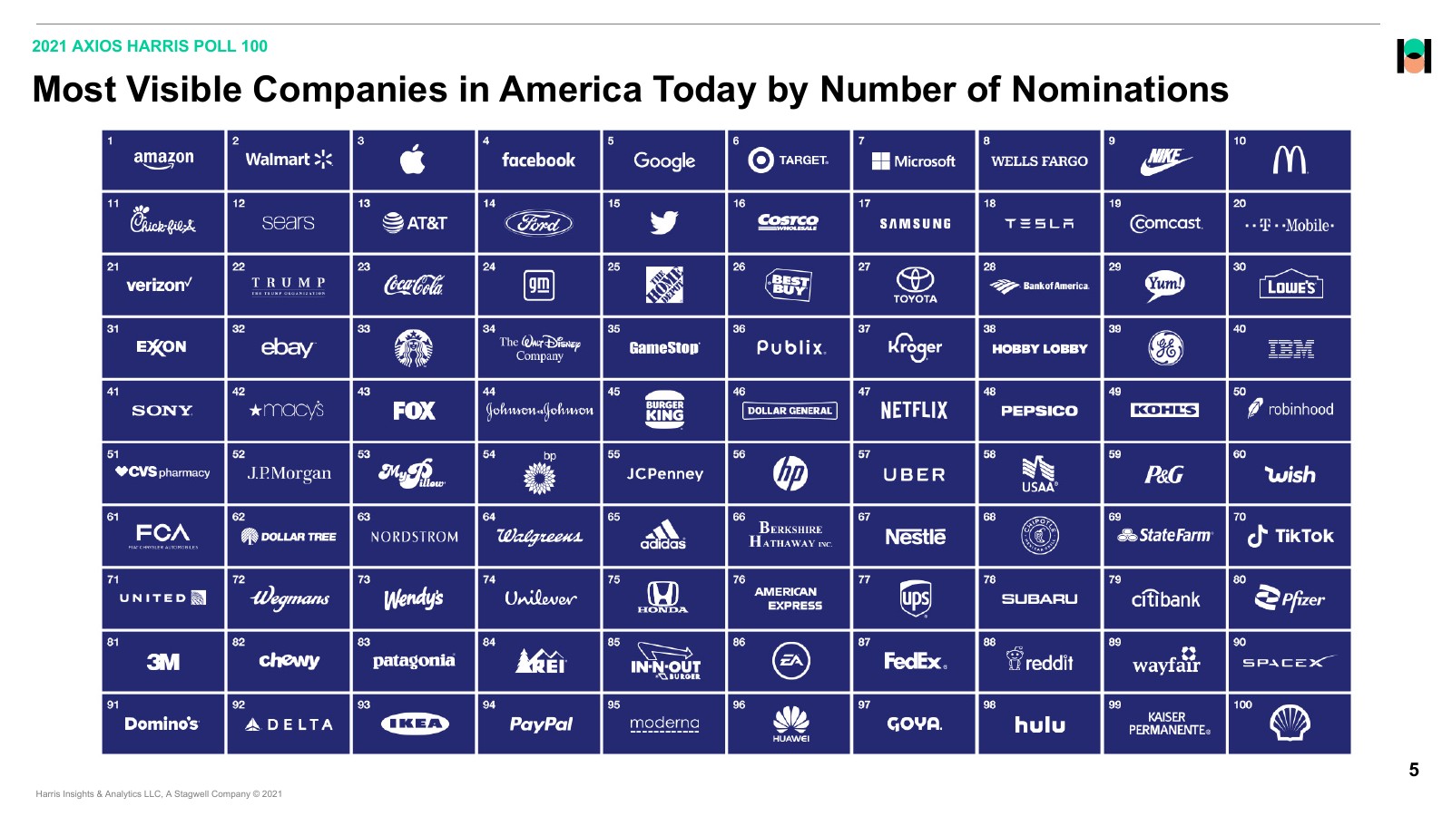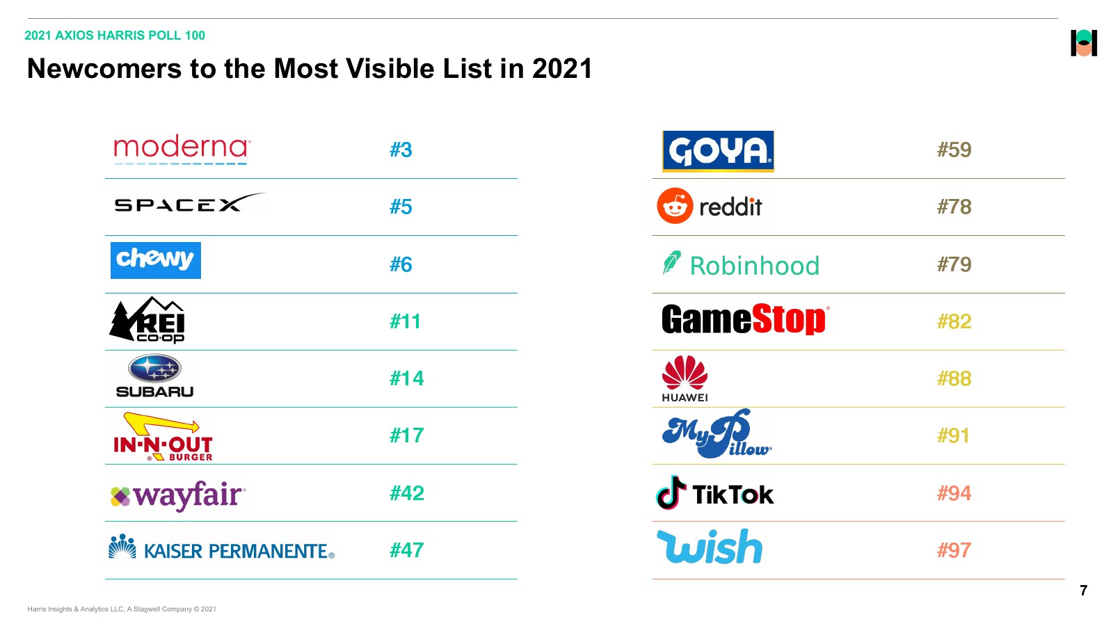今年最具知名度新晋者有三家,Moderna、SpaceX和Chewy进入排行榜的前十名。其他首次进入榜单的公司包括 REI(第11名)、In-n-Out(第17名)、Reddit(第78名)和TikTok(第94名)。