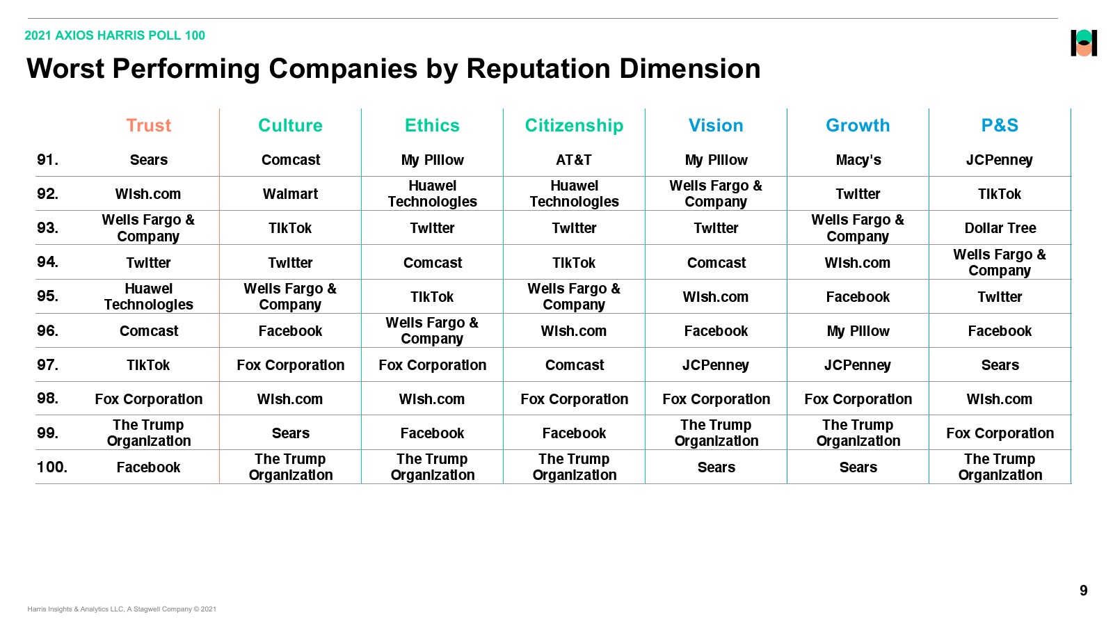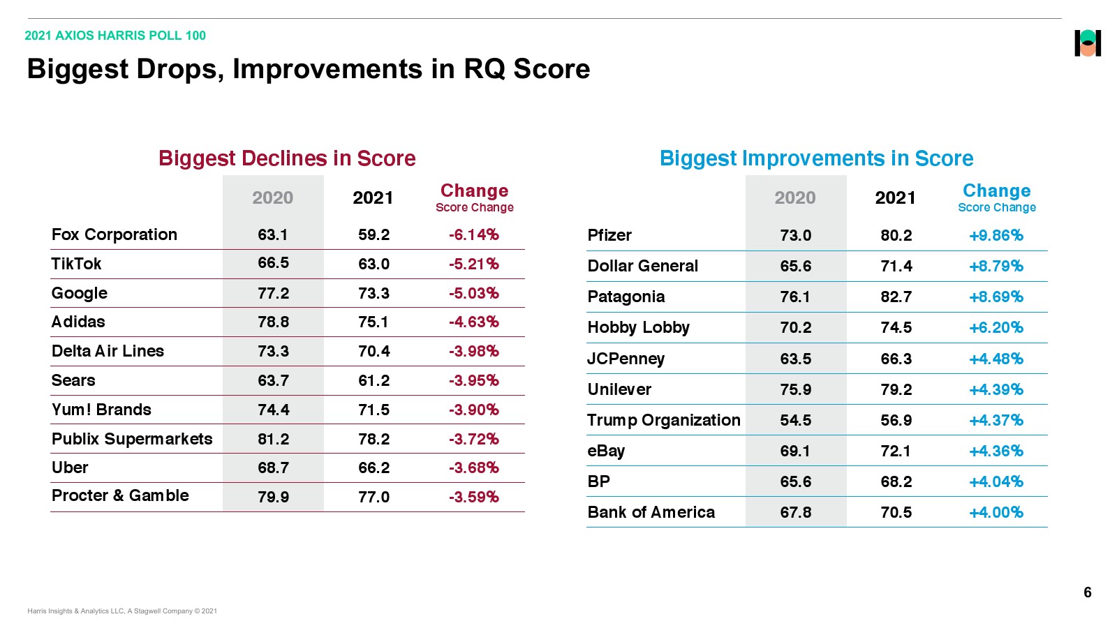 另一方面,福克斯的得分下降幅度最大(-3.9分),从2020年的63.1分降至今年的59.2分。它在信任、公民身份、产品和服务方面排名垫底。尽管TikTok在美国越来越受欢迎,但它的得分比去年下降了3.5分,降至63分。