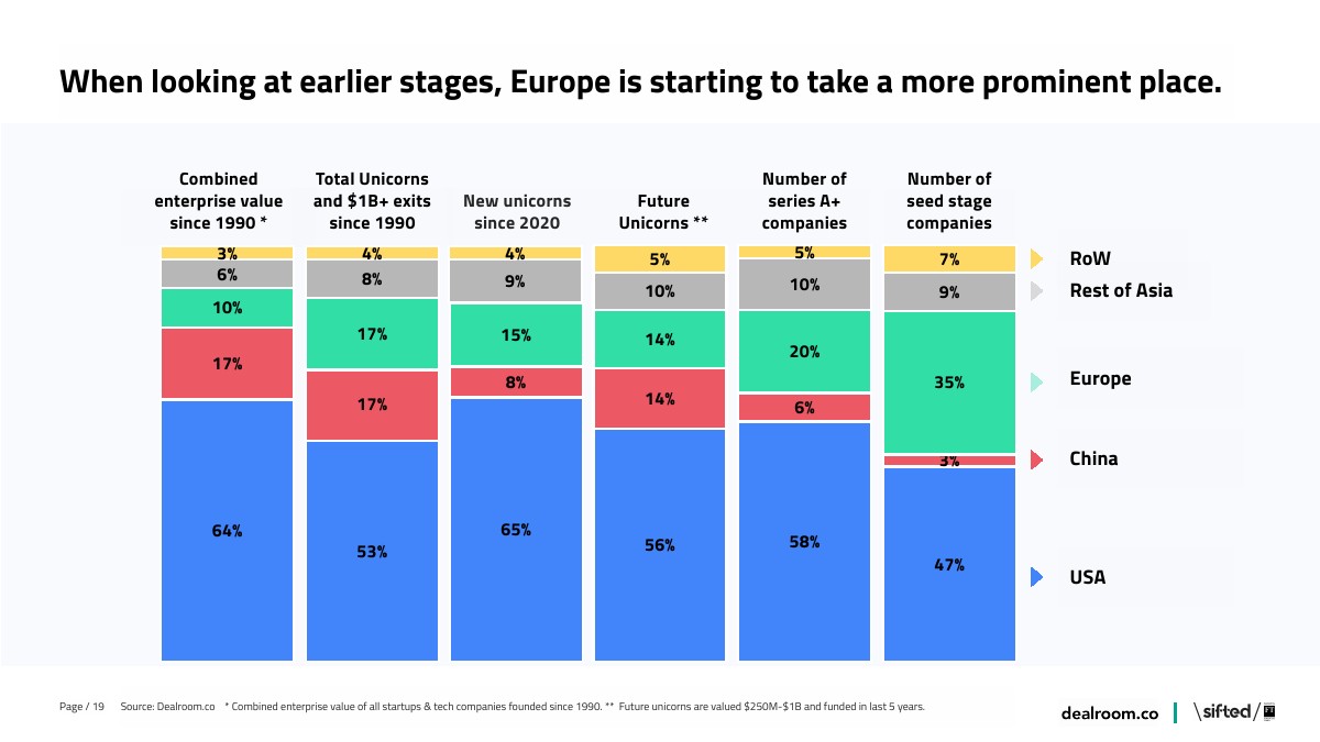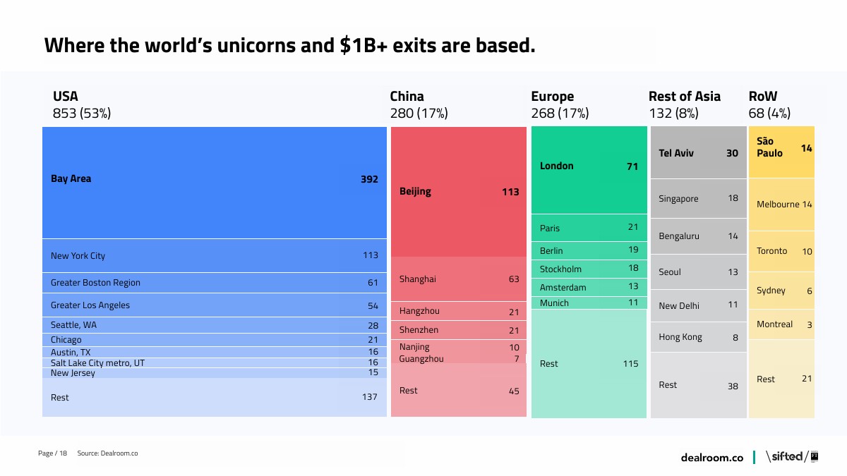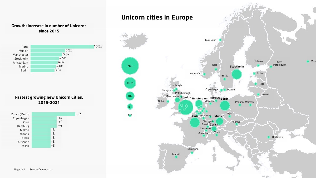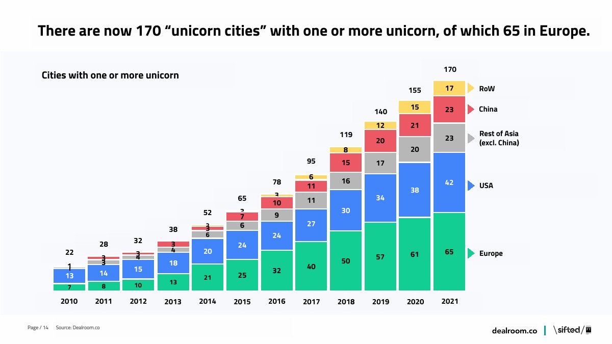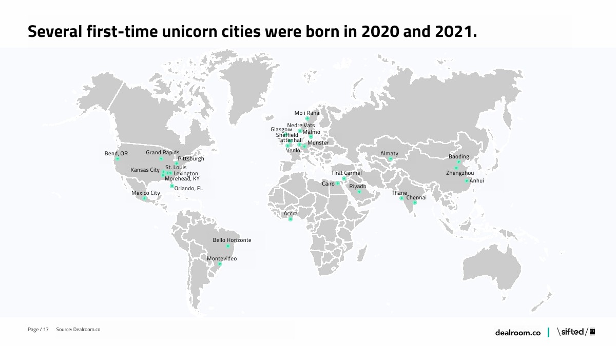 现在全球有170个城市至少有一家独角兽,欧洲有独角兽的城市数量最多。