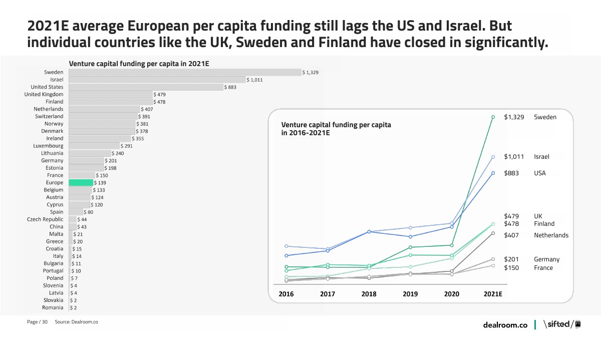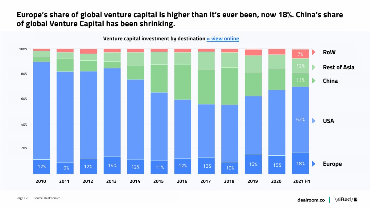 2021年前6个月全球风险投资额达2640亿欧元,同比增长2.3倍。对欧洲初创企业的投资同比增长2.9倍,达到490亿欧元。
