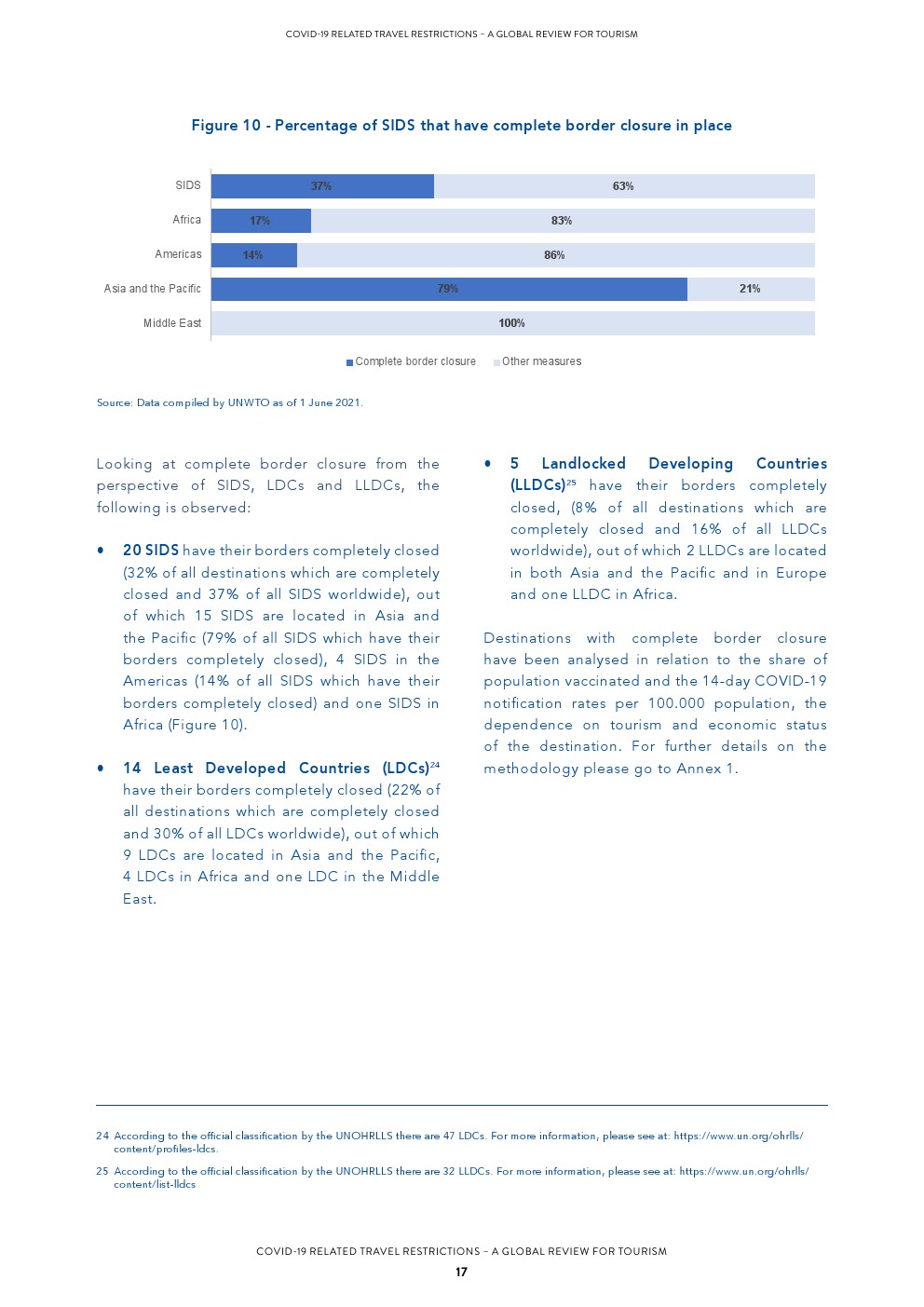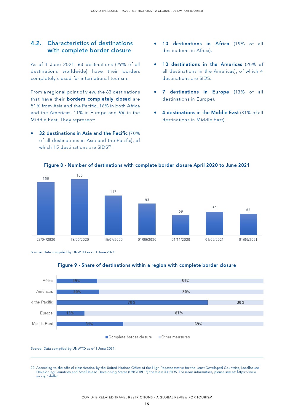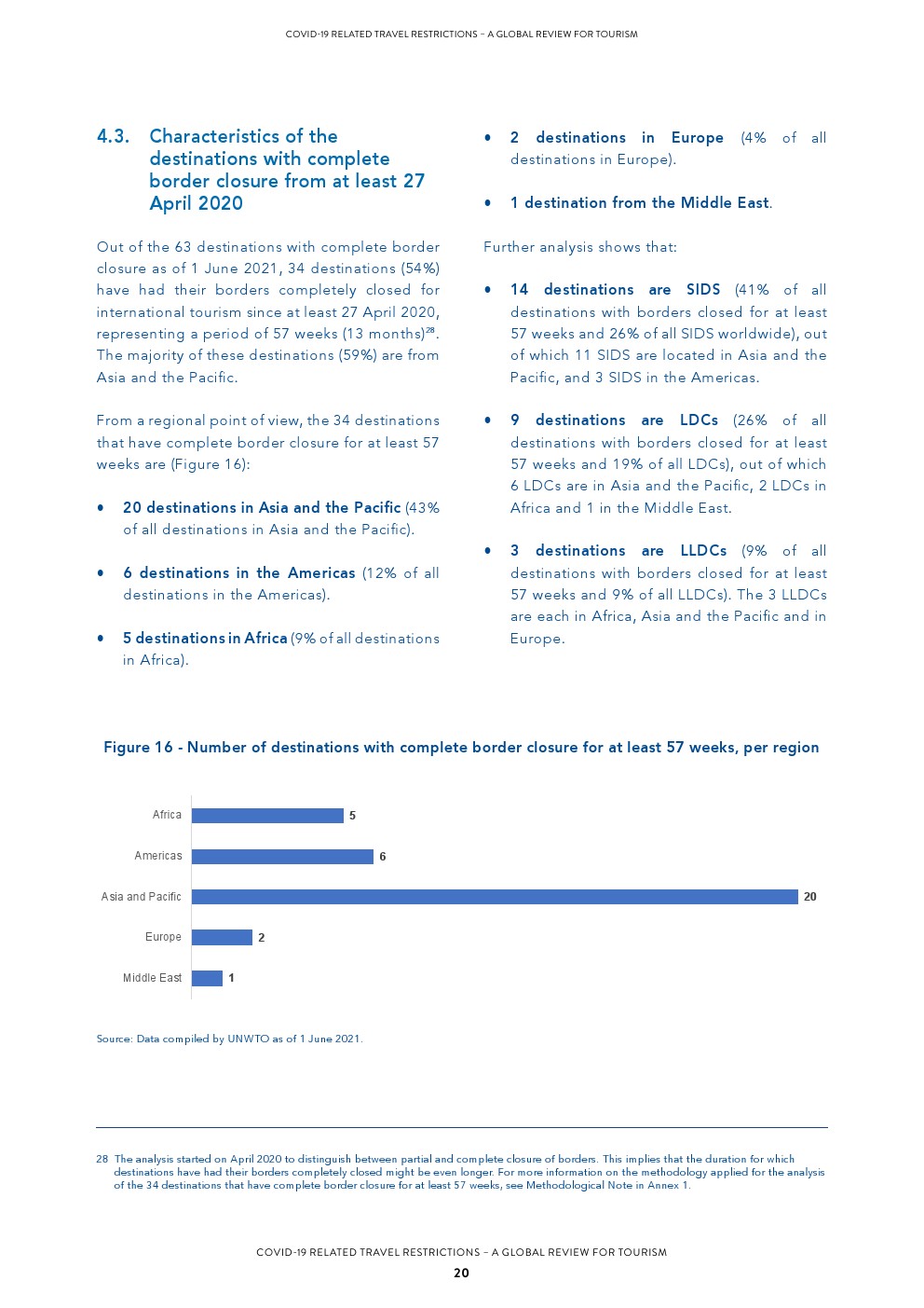 旅行限制仍然是旅游圣地广泛采用的限制新冠病毒传播的措施。虽然在2020年3月主要在亚洲、太平洋和欧洲观察到了这种限制,但随着新冠病毒的传播,世界各地很快都实行了限制。截至2020年5月18日,全球75%的旅游圣地所在国家的边界完全关闭,从而使国际旅游业几乎完全停滞。