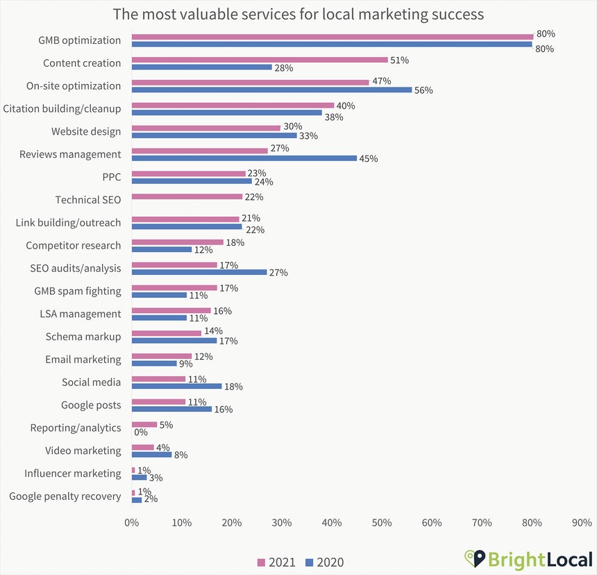 Google My Business优化是目前主要搜索引擎优化服务之一,90%的本地营销人员提供搜索引擎优化服务,甚至比以前的高价值策略更受欢迎。关键字研究和链接构建曾经被认为是最有效的SEO策略,但在2021年的调查中,只有48%的受访者提供链接构建。仍然流行的是内容创作(83%)。