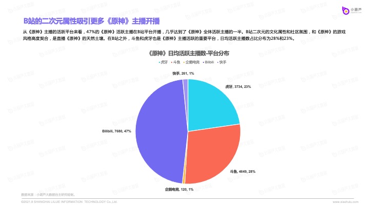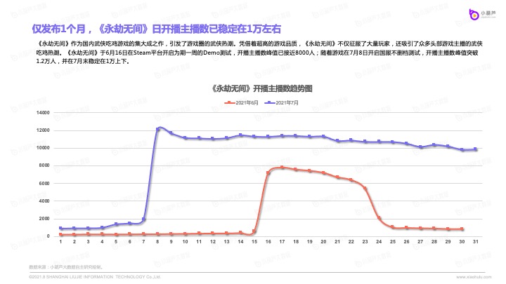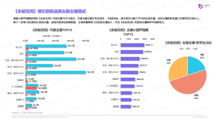 从游戏直播行业的总直播时长来看,整体上呈现平稳上升的趋势。2021年7月,全平台游戏直播总时长达到4947年,环比增长了13.3%,同比增长了8.5%,创下历史新高。在游戏主播数量相对稳定的情况下,游戏主播的平均直播时长越来越长,说明有更多人选择以游戏直播作为主要的甚至是全职工作。