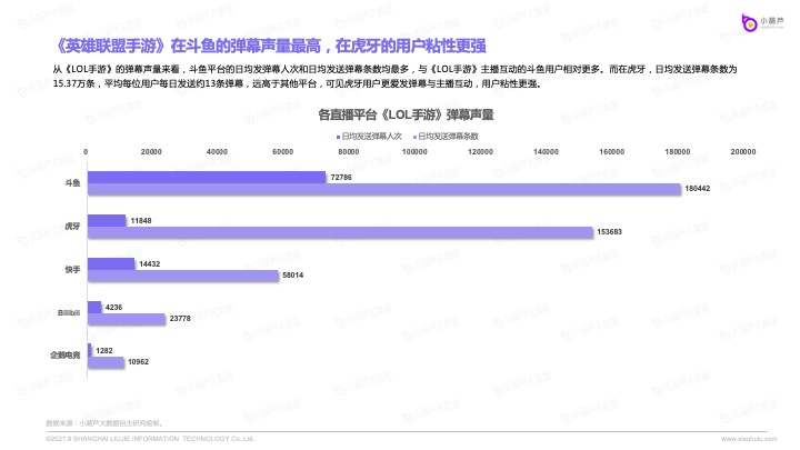 2021年7月,斗鱼平台日均发送弹幕人次达到670.4万人,相较于其他直播平台,斗鱼更多的用户会在观看直播时发送弹幕。从日均弹幕声量排名前四的平台看,虎牙平台的观众日均每人发送弹幕条数为10.9条,远超于其他平台,排名第二的是B站,日均每人发送弹幕条数为8.5条,而发送弹幕人次最多的斗鱼日均每人发送弹幕条数仅为2.9条,可以看出虎牙和B站观众的互动粘性高于其他平台,其观众与主播会进行更加频繁的弹幕交流与互动。