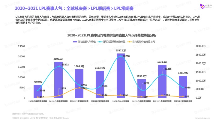 从用户侧而言,相较于2020年疫情较为严重的时期,直播活跃观众及游戏直播活跃观众有着较为明显的回落。环比来看,整体直播送礼物人次在2020年有着显著的增长,并在2021年得到了较好的延续,送礼物人次的增长主要来源于娱乐类直播内容,尽管游戏直播送礼物人次变化幅度不大,但用户的付费打赏能力有所提升。