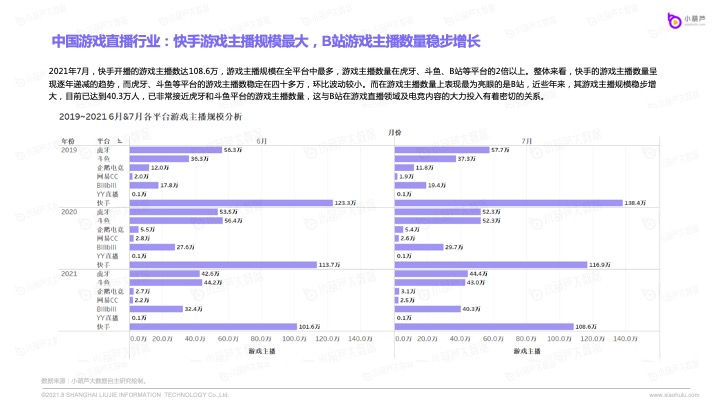 2021年7月,快手开播的游戏主播数达108.6万,游戏主播规模在全平台中最多,游戏主播数量在虎牙、斗鱼、B站等平台的2倍以上。整体来看,快手的游戏主播数量呈现逐年递减的趋势,而虎牙、斗鱼等平台的游戏主播数稳定在四十多万,环比波动较小。而在游戏主播数量上表现最为亮眼的是B站,近些年来,其游戏主播规模稳步增大,目前已达到40.3万人,已非常接近虎牙和斗鱼平台的游戏主播数量,这与B站在游戏直播领域及电竞内容的大力投入有着密切的关系。
