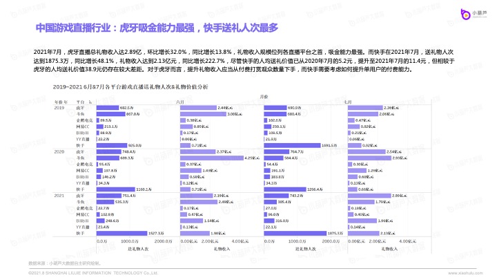 2021年7月,虎牙直播总礼物收入达2.89亿,环比增长32.0%,同比增长13.8%,礼物收入规模位列各直播平台之首,吸金能力最强。而快手在2021年7月,送礼物人次达到1875.3万,同比增长48.1%,礼物收入达到2.13亿元,同比增长222.7%,尽管快手的人均送礼价值已从2020年7月的5.2元,提升至2021年7月的11.4元,但相较于虎牙的人均送礼价值38.9元仍存在较大差距。对于虎牙而言,提升礼物收入应当从付费打赏观众数量下手,而快手需要考虑如何提升单用户的付费能力。