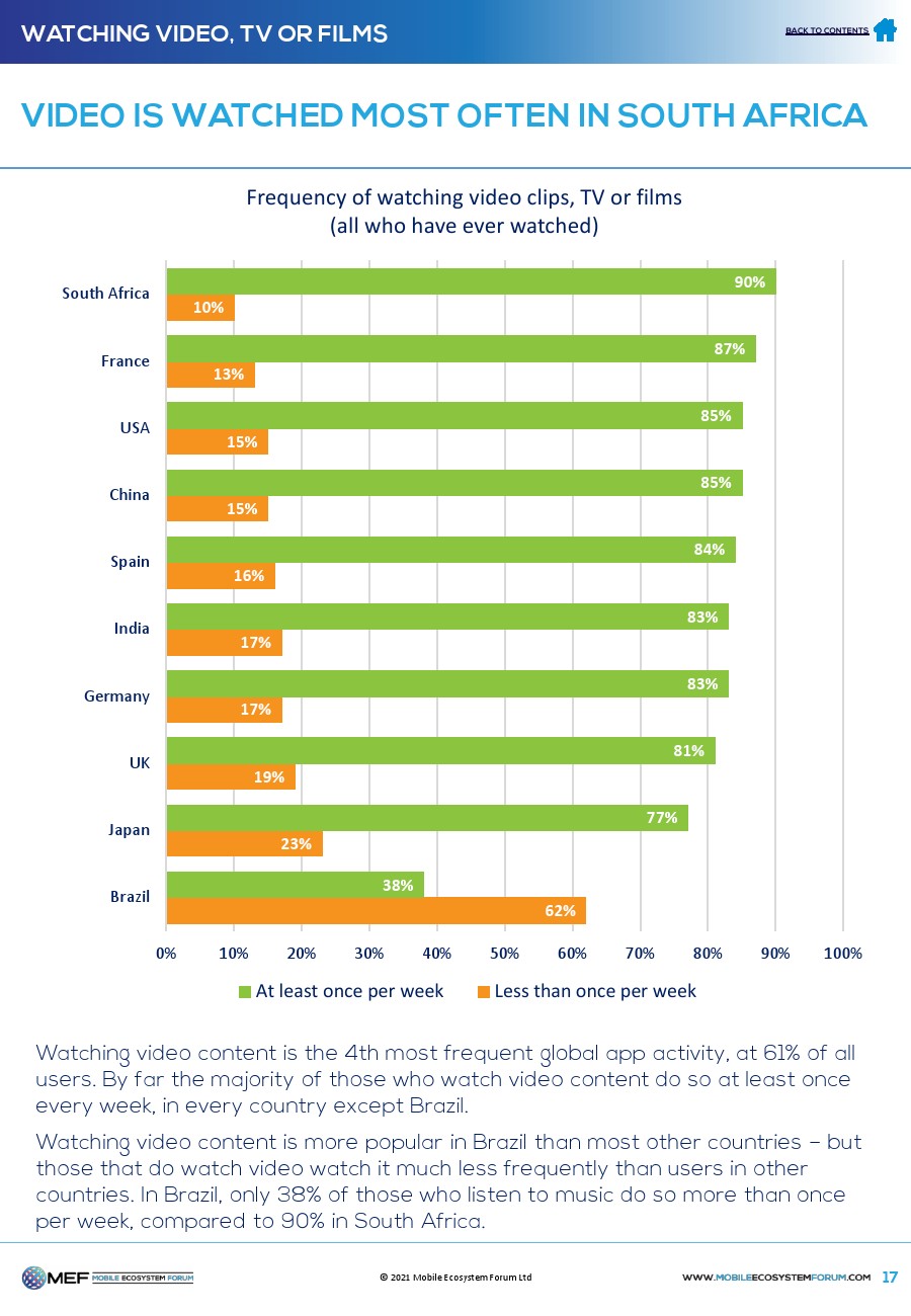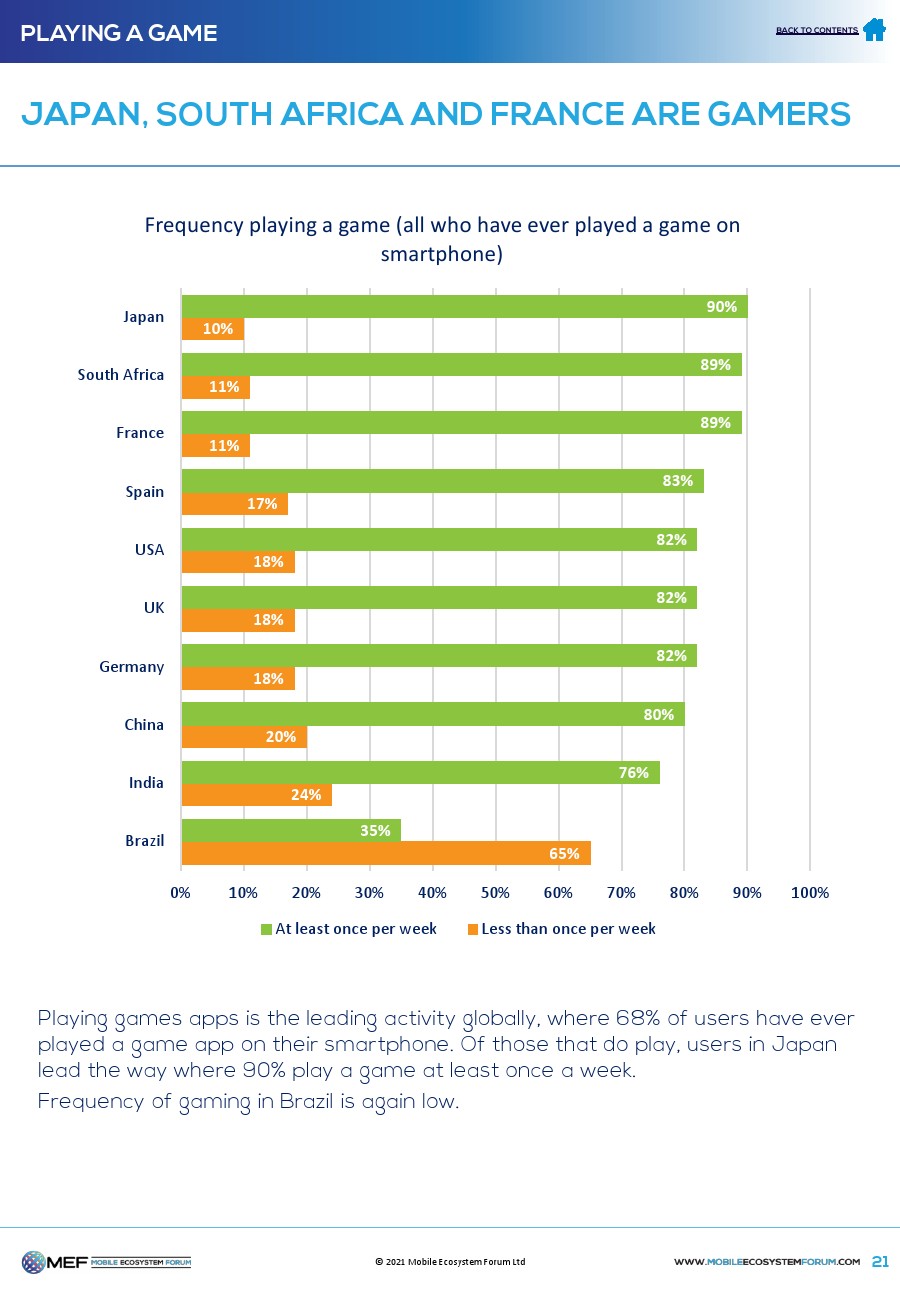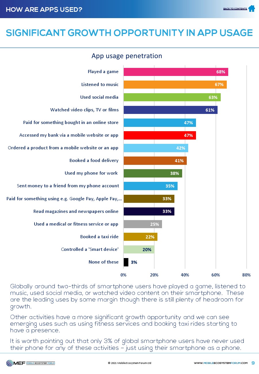 在全球范围内,智能手机用户使用应用程序最常见的四种方式是玩游戏(68%)、听音乐(67%)、访问社交媒体(63%)和观看视频剪辑、电视或电影(61%)。