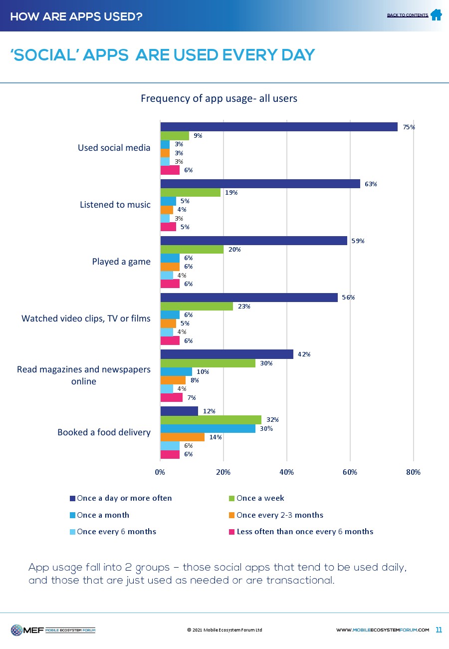 美国有63%的智能手机用户访问社交媒体应用,其中近87%每周访问社交媒体应用程序,而在6/10的美国视频应用用户中有85%每周观看视频。