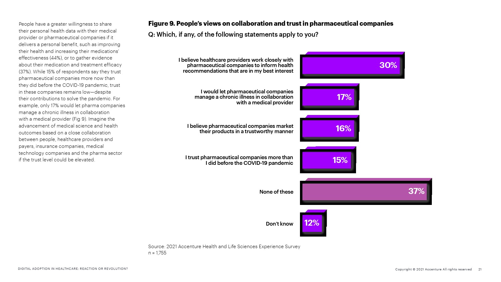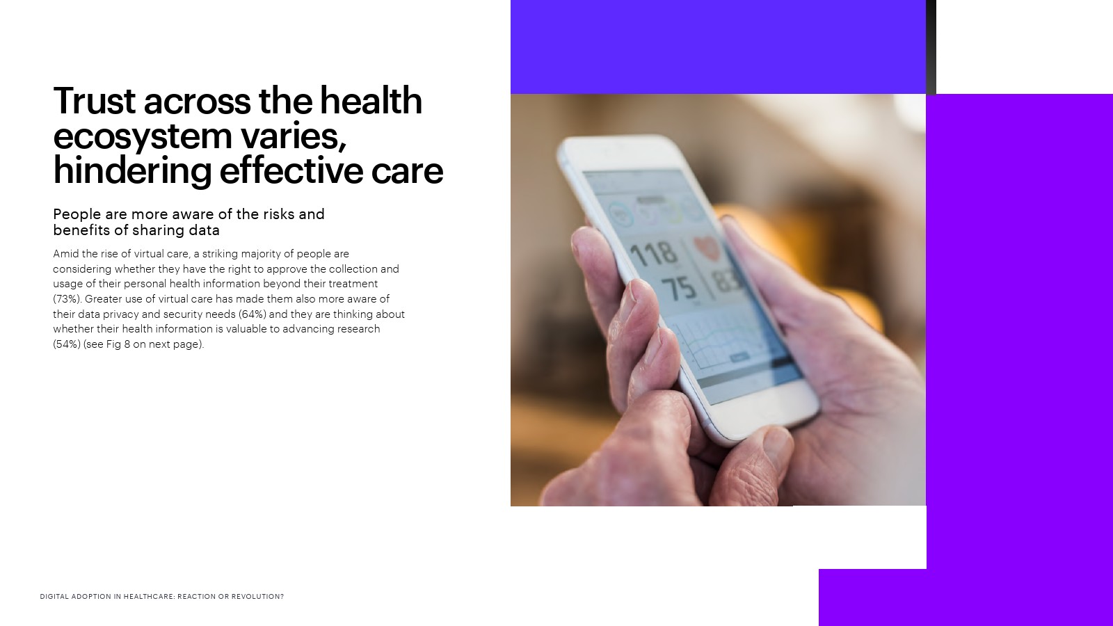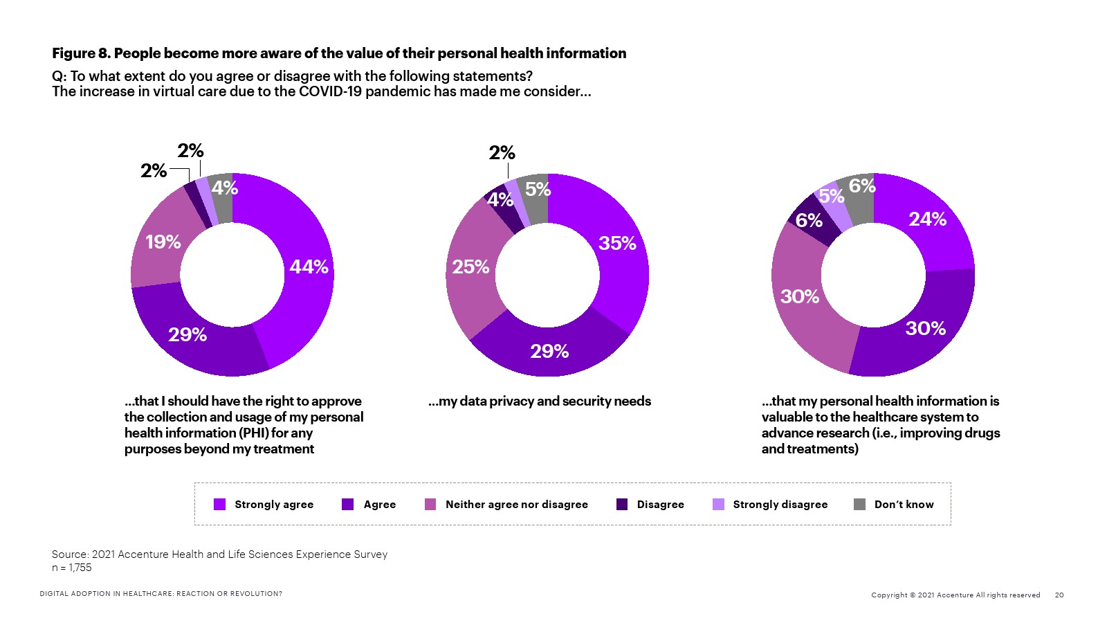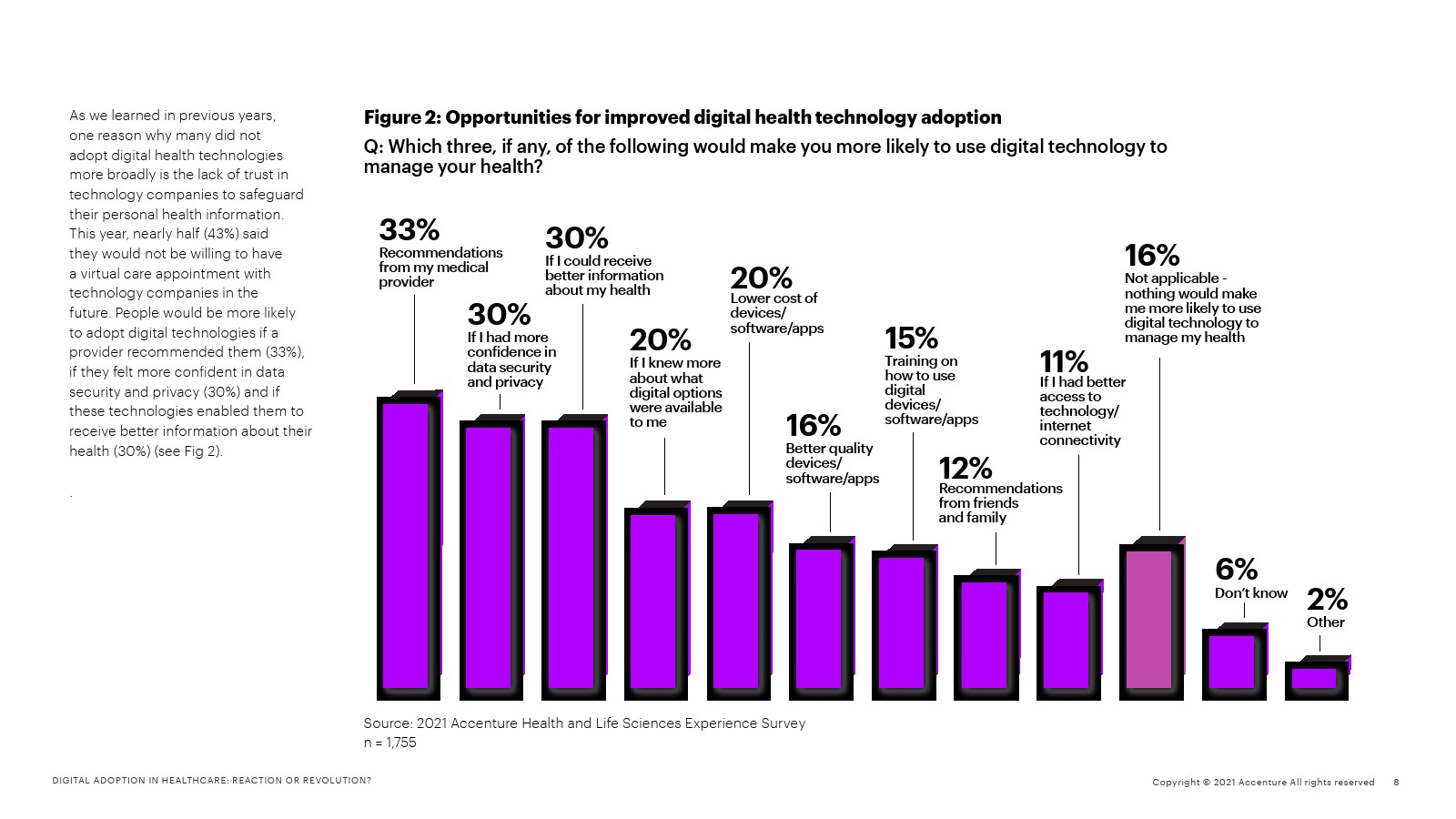 虽然人们并不总是认为数字技术是寻求护理的主要方式,但那些由于触点增加而获得更好体验的人表示,如果供应商推荐使用数字技术(33%),如果他们对数据安全和隐私更有信心(30%),如果这些技术能够让他们获得更好的健康信息(30%),他们就更有可能采用数字技术。人们还表示,如果与医疗机构或制药公司分享个人健康数据能获得个人利益,例如改善健康、提高药物疗效(44%),或收集有关药物和治疗效果的证据(37%),他们会更愿意与医疗机构或制药公司分享个人健康数据。