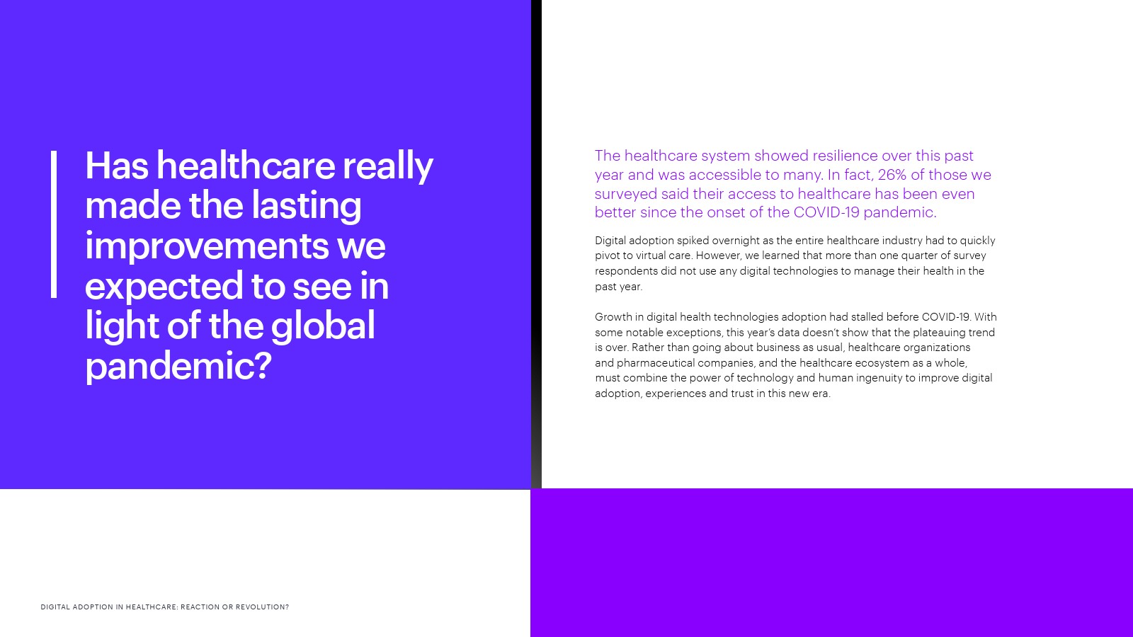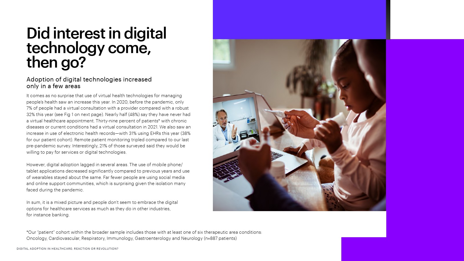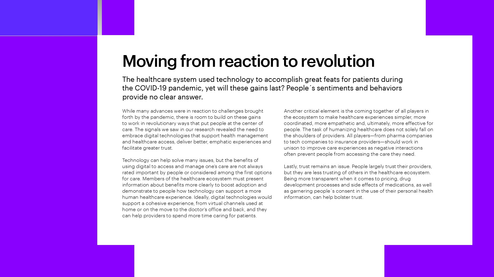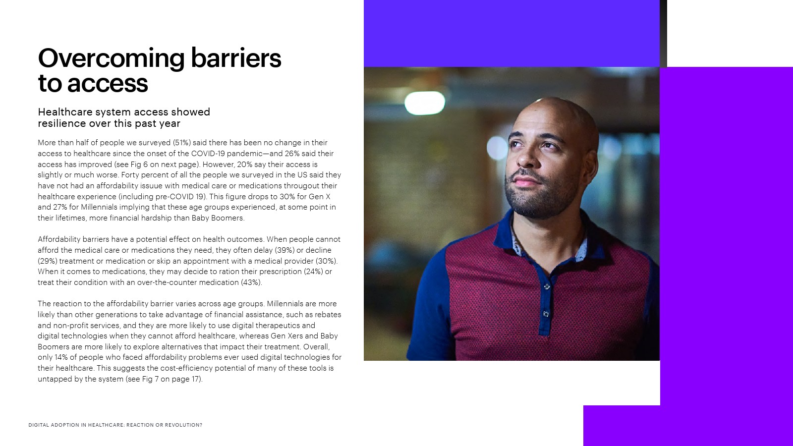 虽然人们并不总是认为数字技术是寻求护理的主要方式,但那些由于触点增加而获得更好体验的人表示,如果供应商推荐使用数字技术(33%),如果他们对数据安全和隐私更有信心(30%),如果这些技术能够让他们获得更好的健康信息(30%),他们就更有可能采用数字技术。人们还表示,如果与医疗机构或制药公司分享个人健康数据能获得个人利益,例如改善健康、提高药物疗效(44%),或收集有关药物和治疗效果的证据(37%),他们会更愿意与医疗机构或制药公司分享个人健康数据。