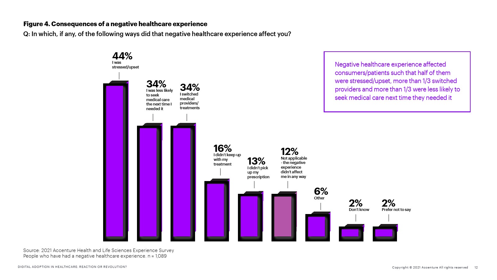 与此同时,负面的医疗经历对治疗结果也有严重影响。那些体验了负面医疗体验的受访者中有34%表示他们下次生病时不太可能寻求医疗,同样数量的人会更换了医疗机构或治疗方法。还有人因为这些糟糕的经历而没有拿到处方。