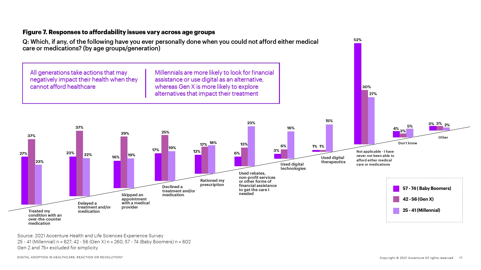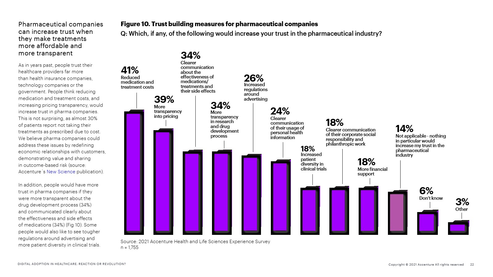 该报告还强调了对制药行业的信任与药物成本之间的关系。59%的受访者表示,他们在某个时候难以支付医疗费用。当费用成为一个问题时,39%的人仍会选择推迟的治疗,29%的受访者会拒绝治疗。有研究表明,近30%的美国患者由于费用原因没有按照规定进行治疗。