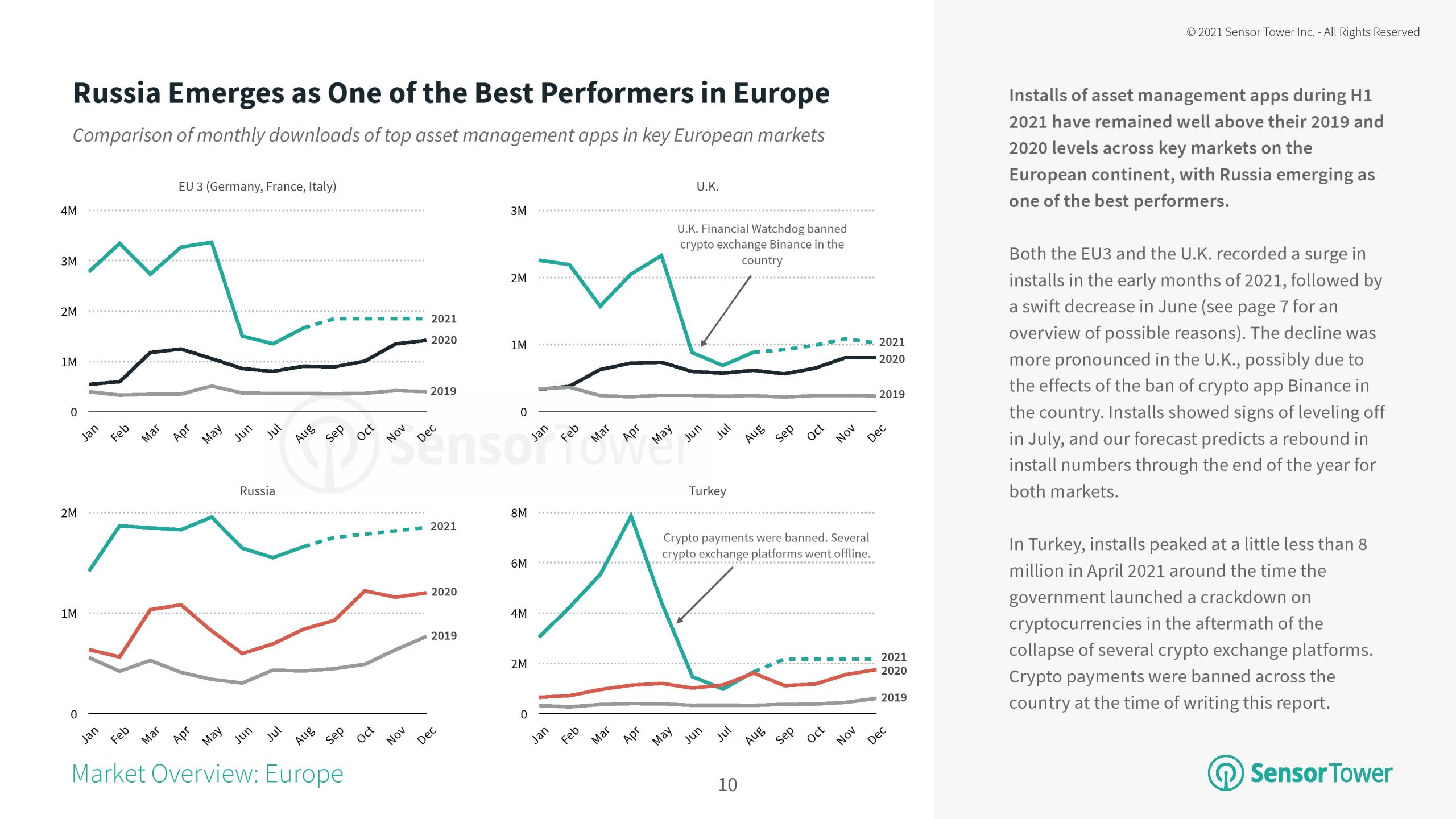 Tinkoff Investments是2021年上半年欧洲下载量最多的多资产交易应用程序,同比增长112%,达到330万次。几乎所有的安装都来自俄罗斯的应用商店,今年上半年欧洲下载量的98%来自俄罗斯的应用商店,这表明这类应用仍然主要针对个别市场。