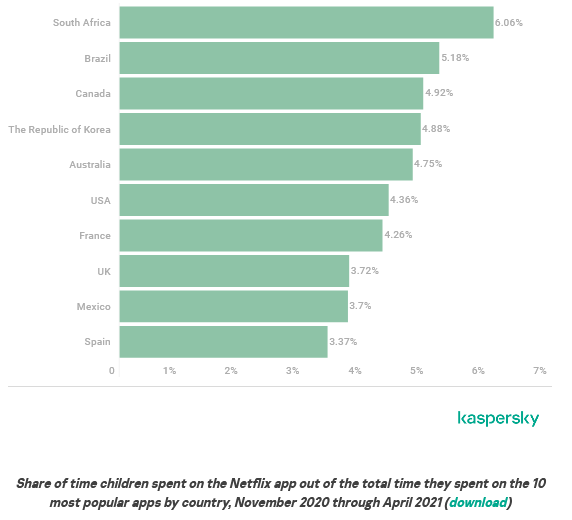南亚的最大访问者来源是印度,占54.91%。其次是沙特阿拉伯和南非,分别占52.09%和51.87%。俄罗斯联邦(41.08%)、哈萨克斯坦(40.14%)和英国(40.12%)儿童更喜欢在电脑上看视频。