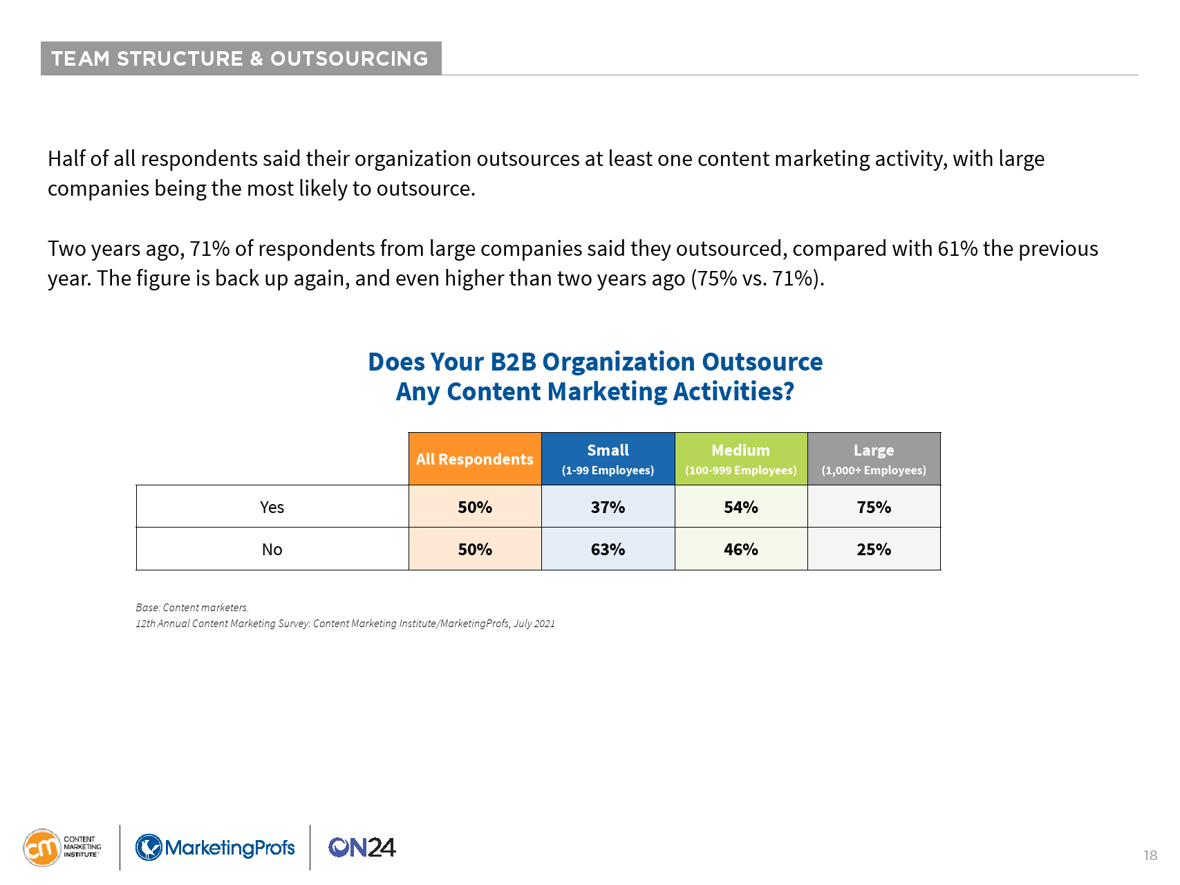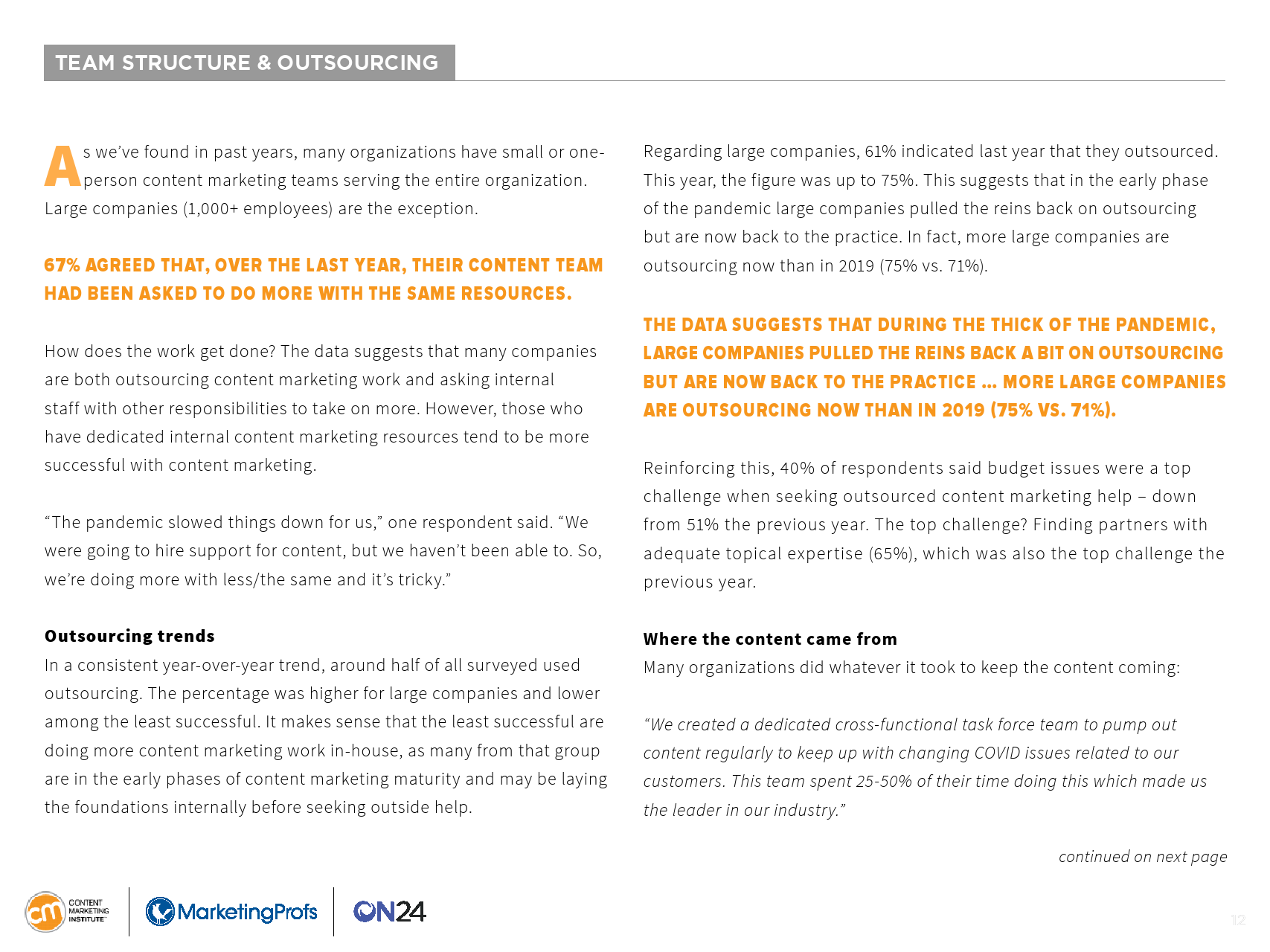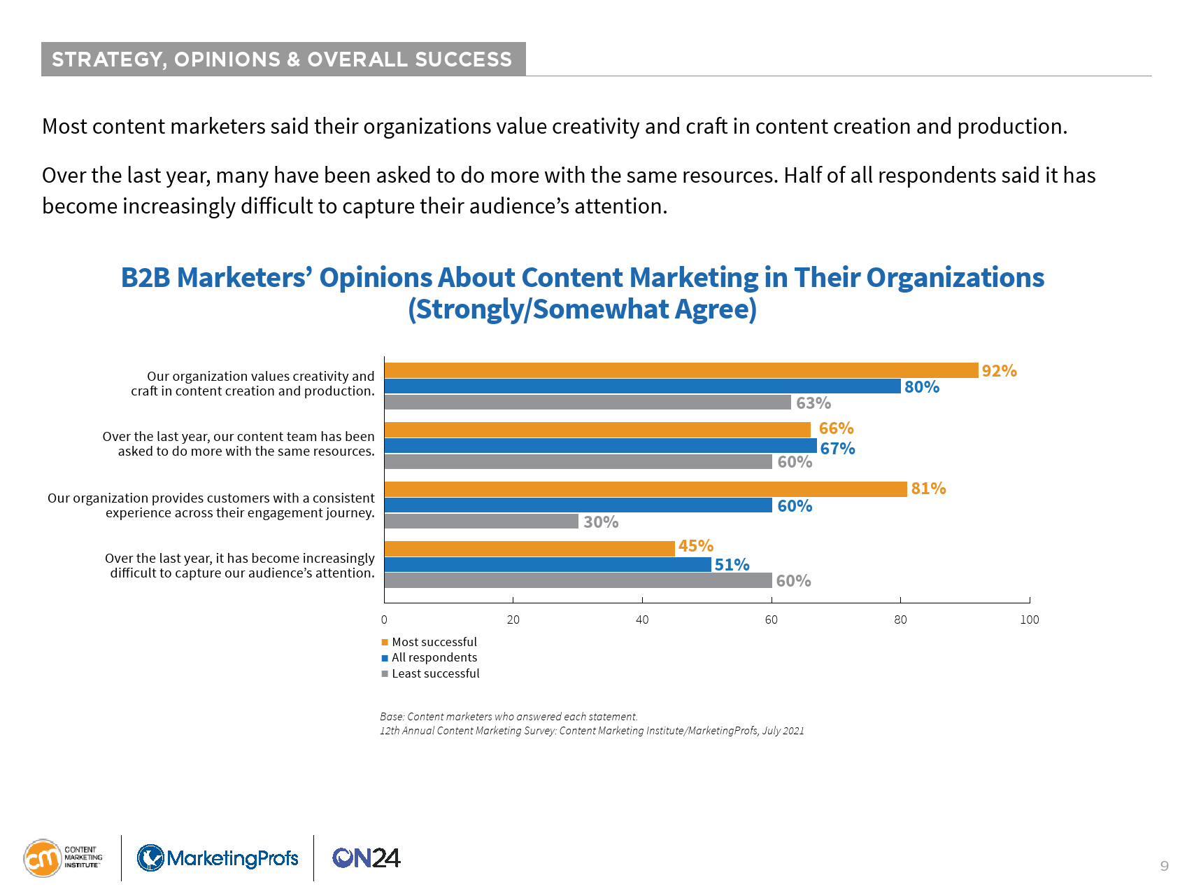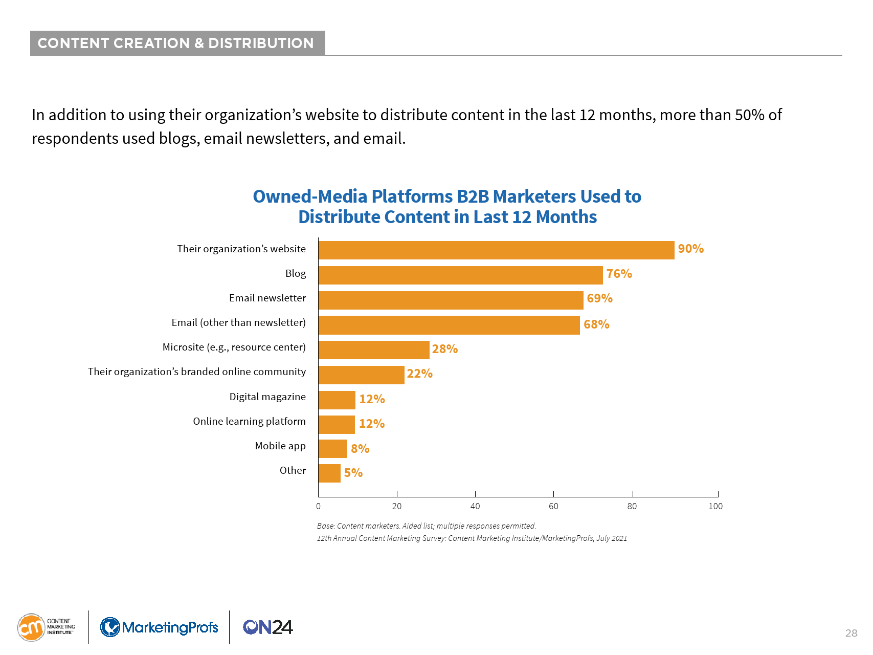 大多数B2B内容营销人员今年都在短文和帖子(少于3000字)上投入了大量资金。在过去的12个月里,90%的受访者使用或创建了此类内容。大多数人还使用了视频(66%)、虚拟活动/网络研讨会/在线课程(64%)和案例研究(61%)。