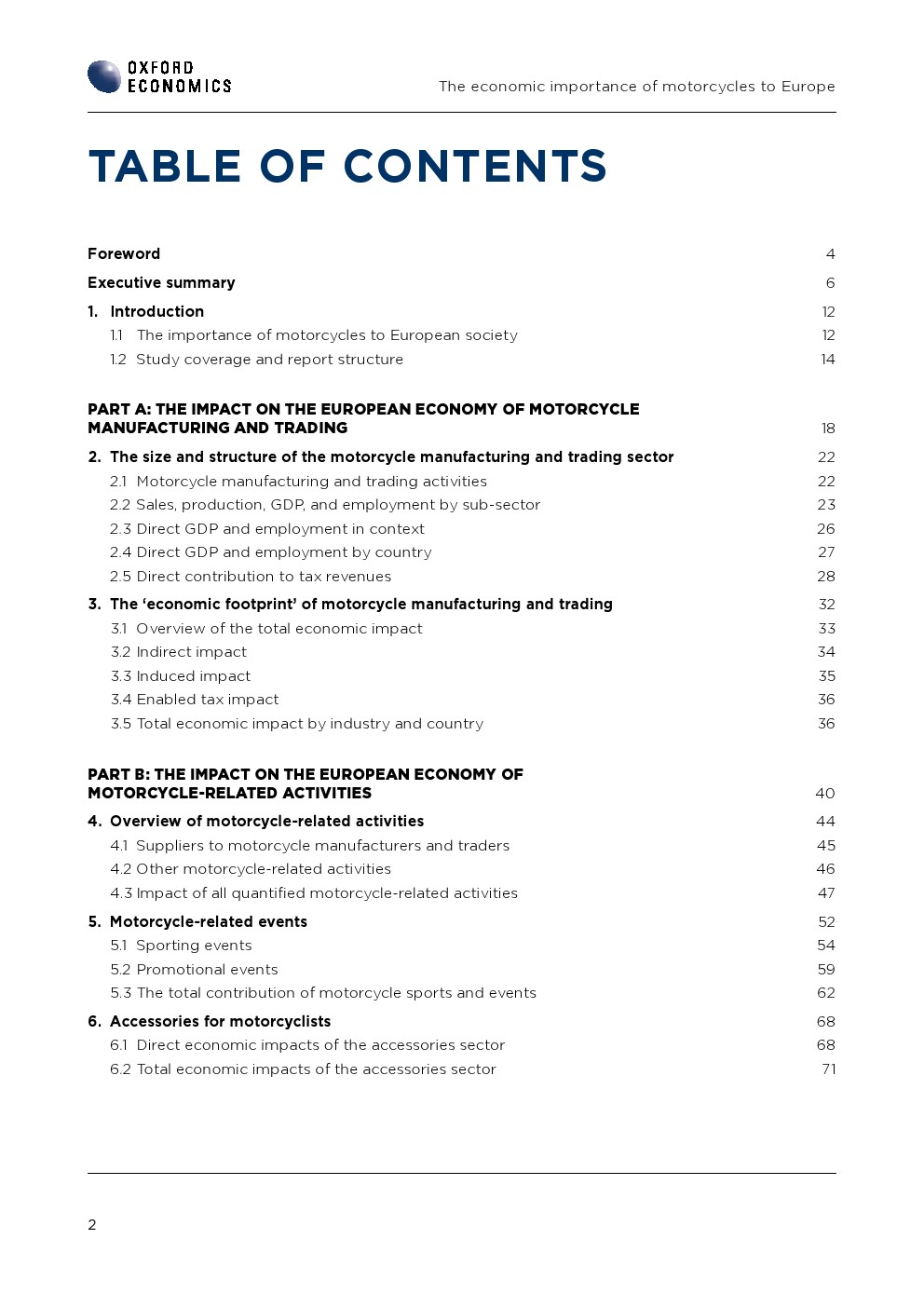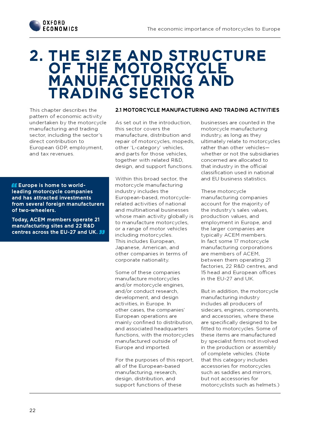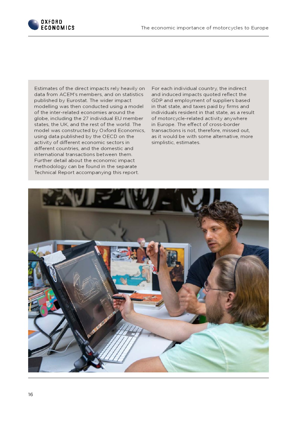 该行业需要的原材料、商品、能源和服务供应支撑了其全球供应链中56亿欧元的间接GDP贡献(欧洲)和89000个间接就业机会。由摩托车制造商和贸易商贡献的欧洲年度GDP总额可达到159亿欧元,涉及291000个就业岗位,年度税收总额约为135亿欧元。