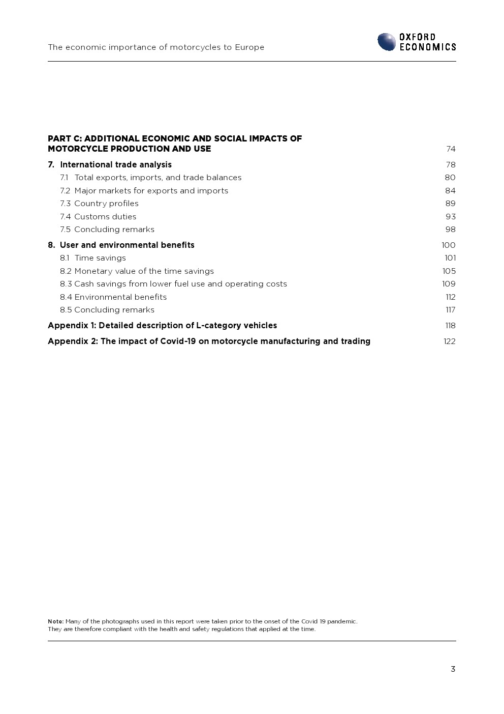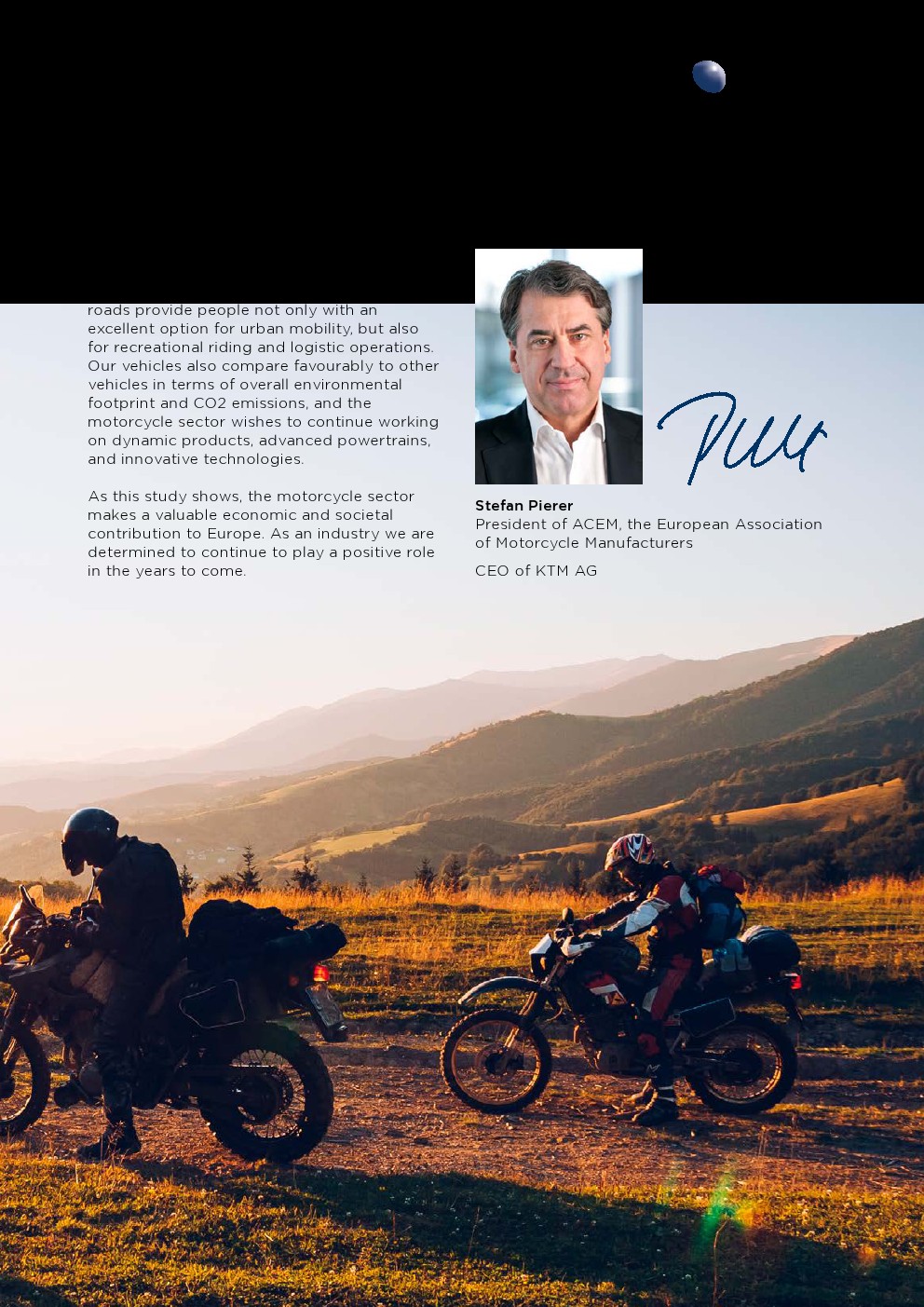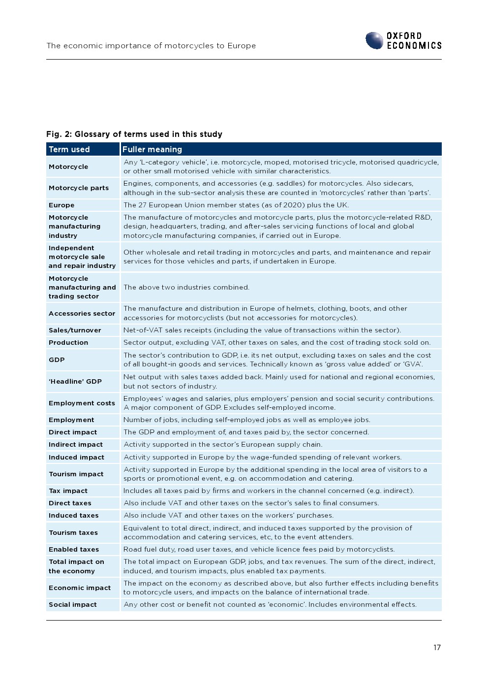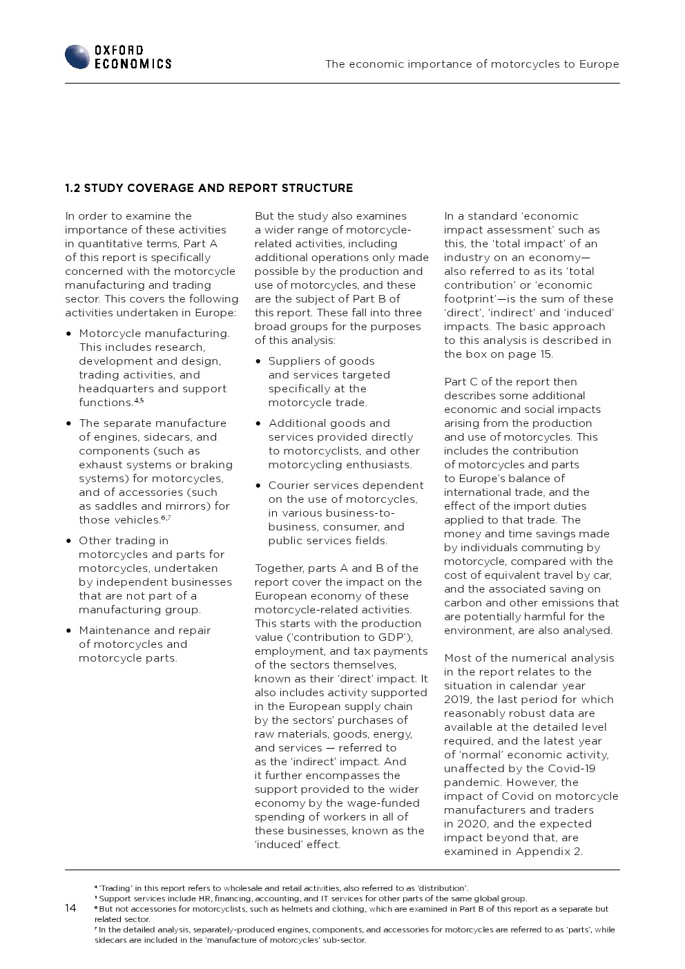该行业需要的原材料、商品、能源和服务供应支撑了其全球供应链中56亿欧元的间接GDP贡献(欧洲)和89000个间接就业机会。由摩托车制造商和贸易商贡献的欧洲年度GDP总额可达到159亿欧元,涉及291000个就业岗位,年度税收总额约为135亿欧元。