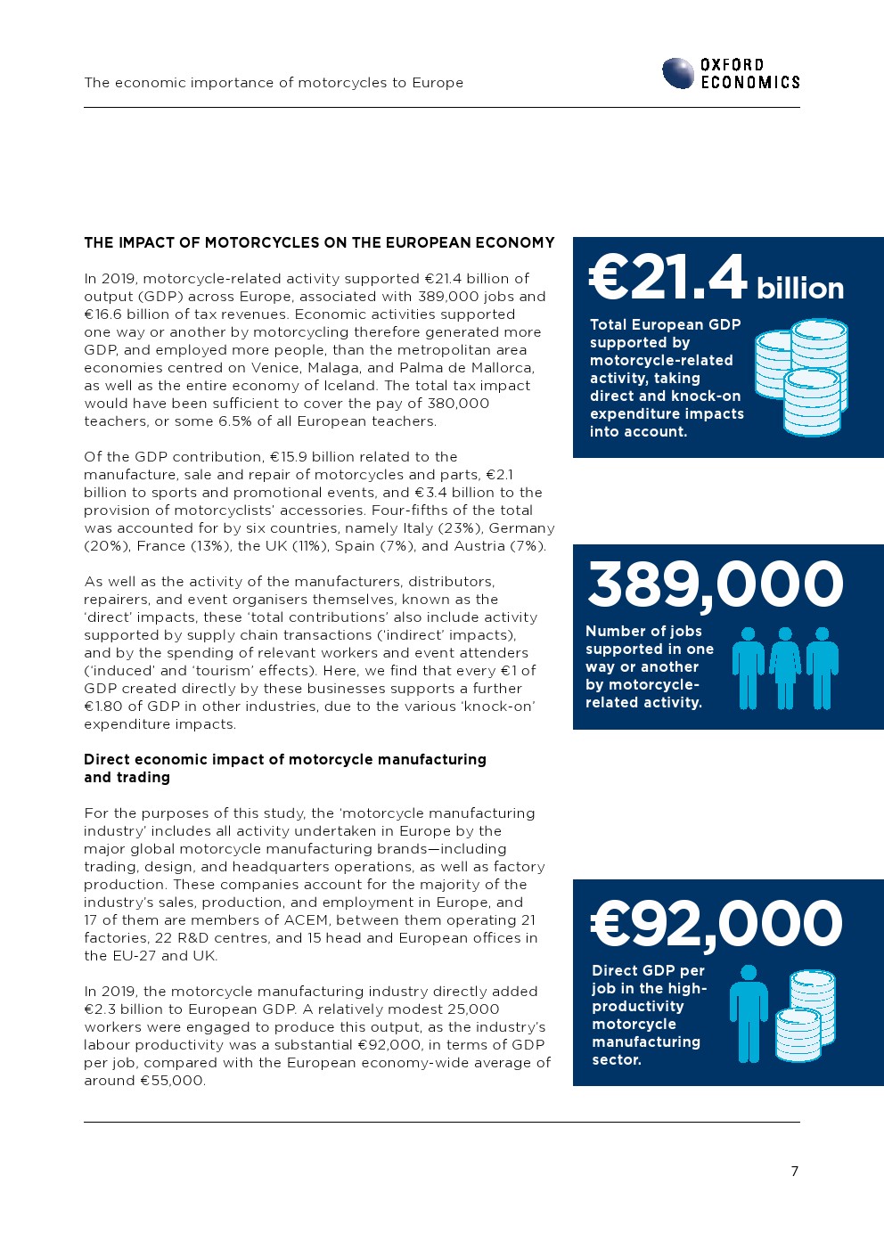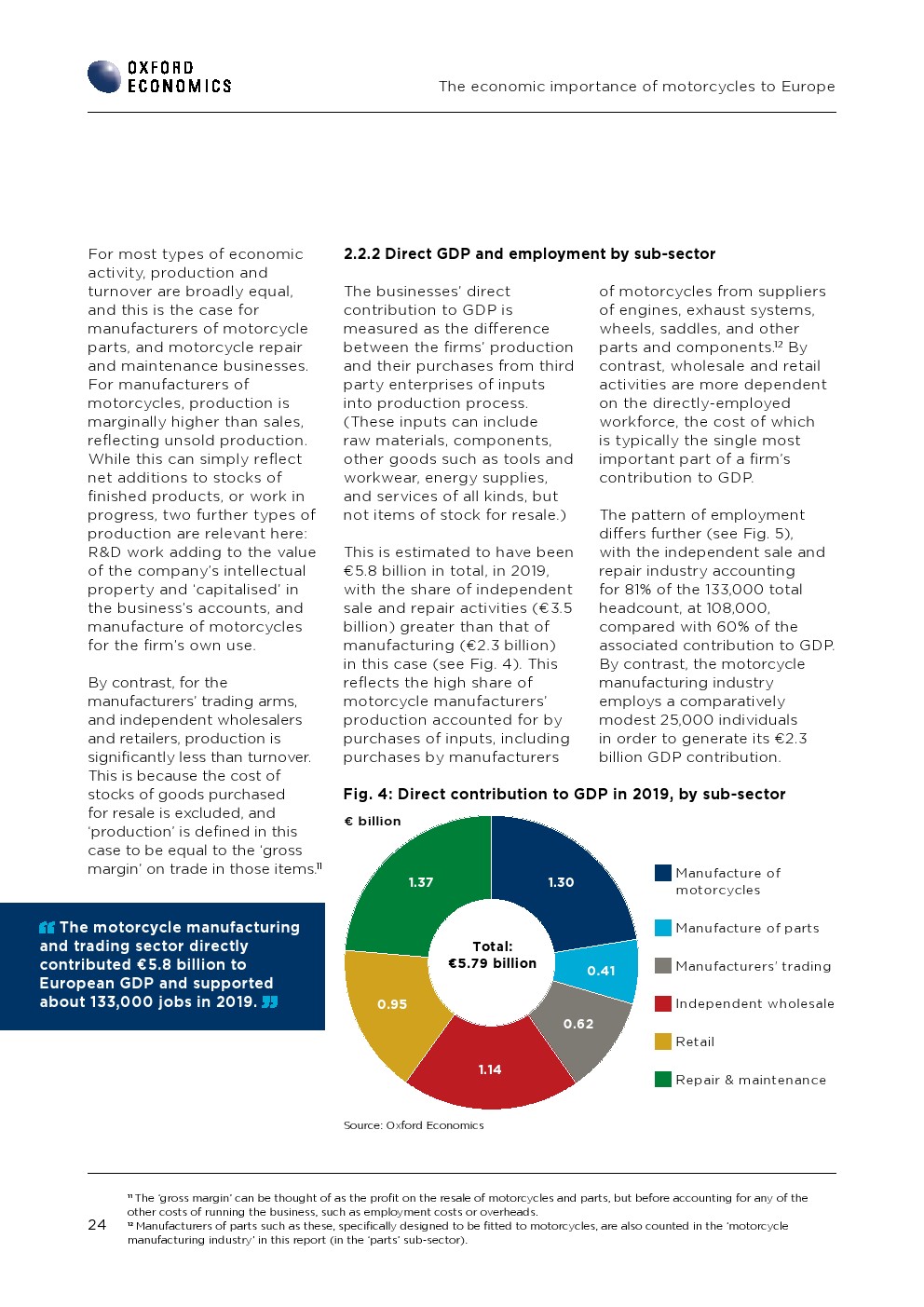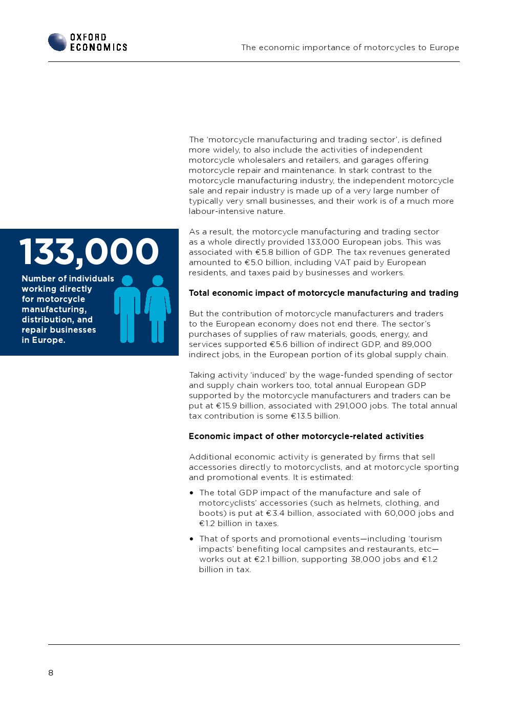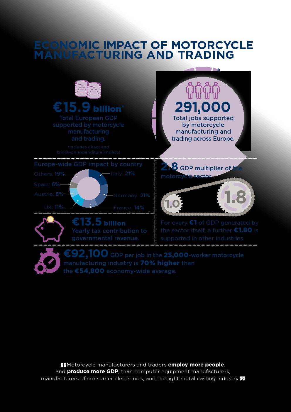 摩托车制造和贸易作为一个整体直接提供了133000个工作岗位。58亿欧元的GDP与该行业有关,产生的税收达50亿欧元,包括欧洲居民,以及企业和工人缴纳的税款。