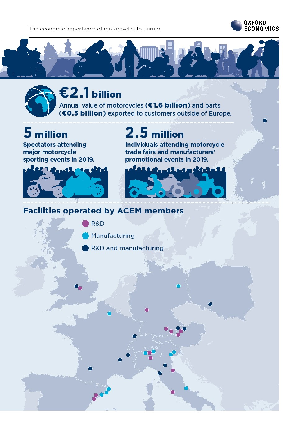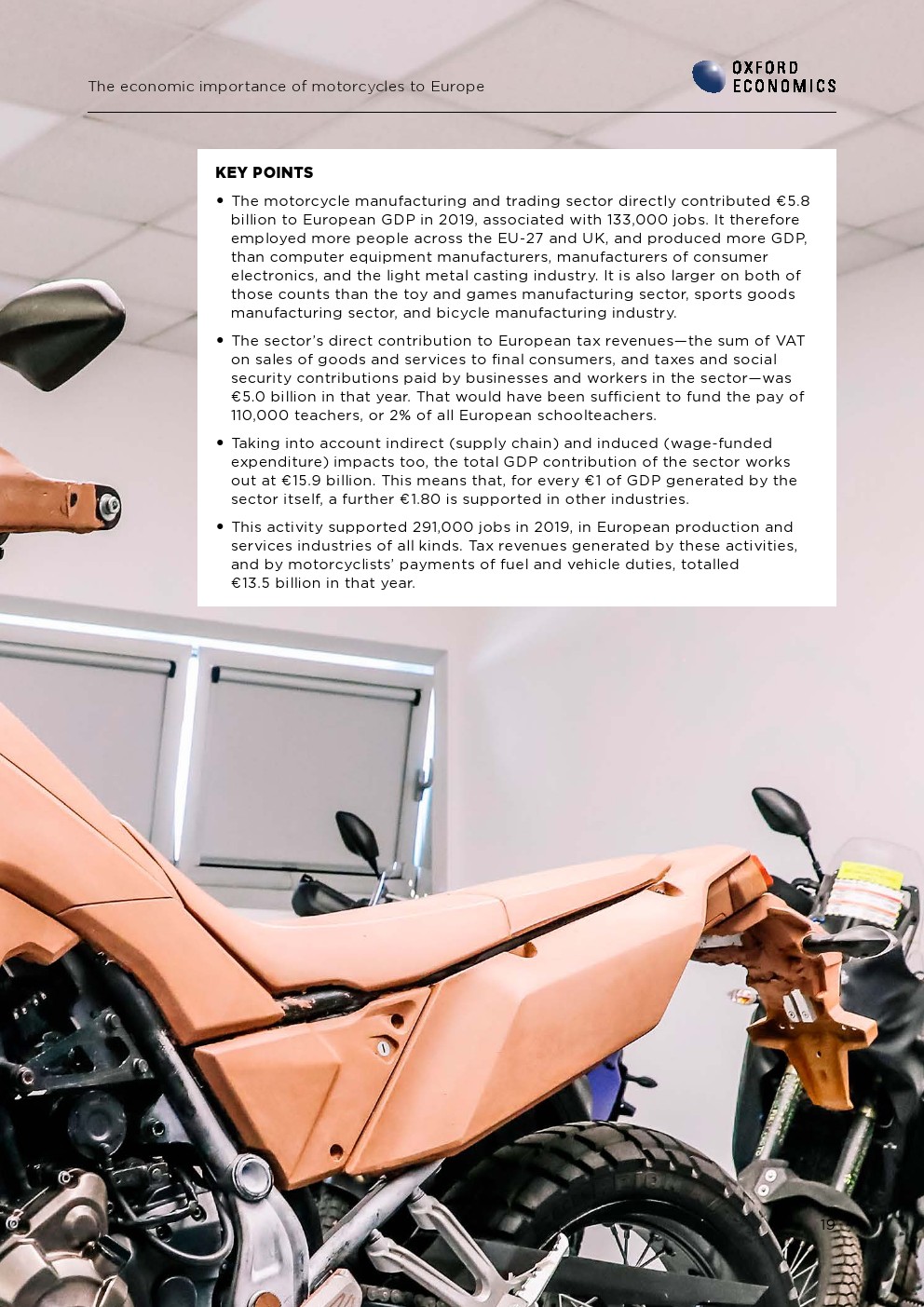 2019年,摩托车支撑了整个欧洲214亿欧元的产出(GDP),涉及389000个就业岗位和166亿欧元的税收收入。总税收足以支付380000名教师的工资,占所有欧洲教师的6.5%。