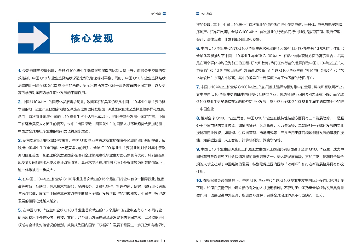 《高校校友观察:中外高校毕业生职业发展研究与展望2021》是《高校校友观察》系列报告的第二期,在第一期聚焦于中国十所“双一流”高校(U10)毕业生职业发展的基础上,将研究范围扩大至全球QS排名前100所高校(G100),对比了中外高校毕业生在深造、就业及国际迁移等方面的异同,深入探讨了中外顶尖高校人才职业发展的特征及其影响因素,为了解新时期国际人才流动趋势、调整和制定人才发展战略提供了有益参考。