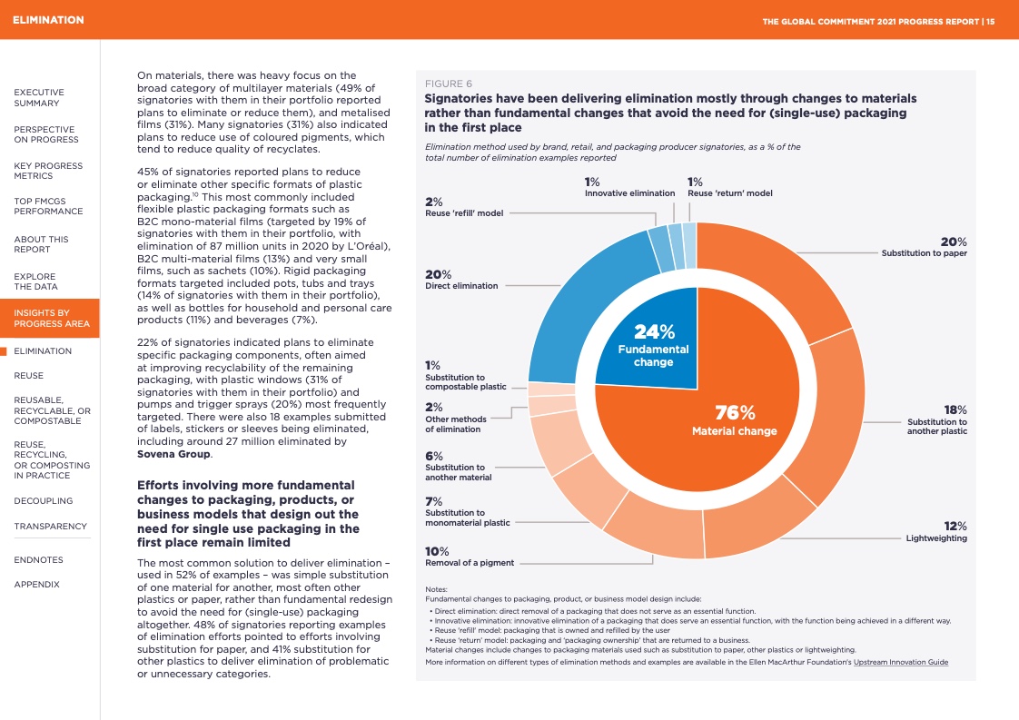 但是,部分领域进展有限,具体体现在提高塑料包装的可回收性和减少对一次性包装的总体需求;向可重复使用的包装转型的进展有限;减塑相关努力仍集中在有限的材料和形式上。