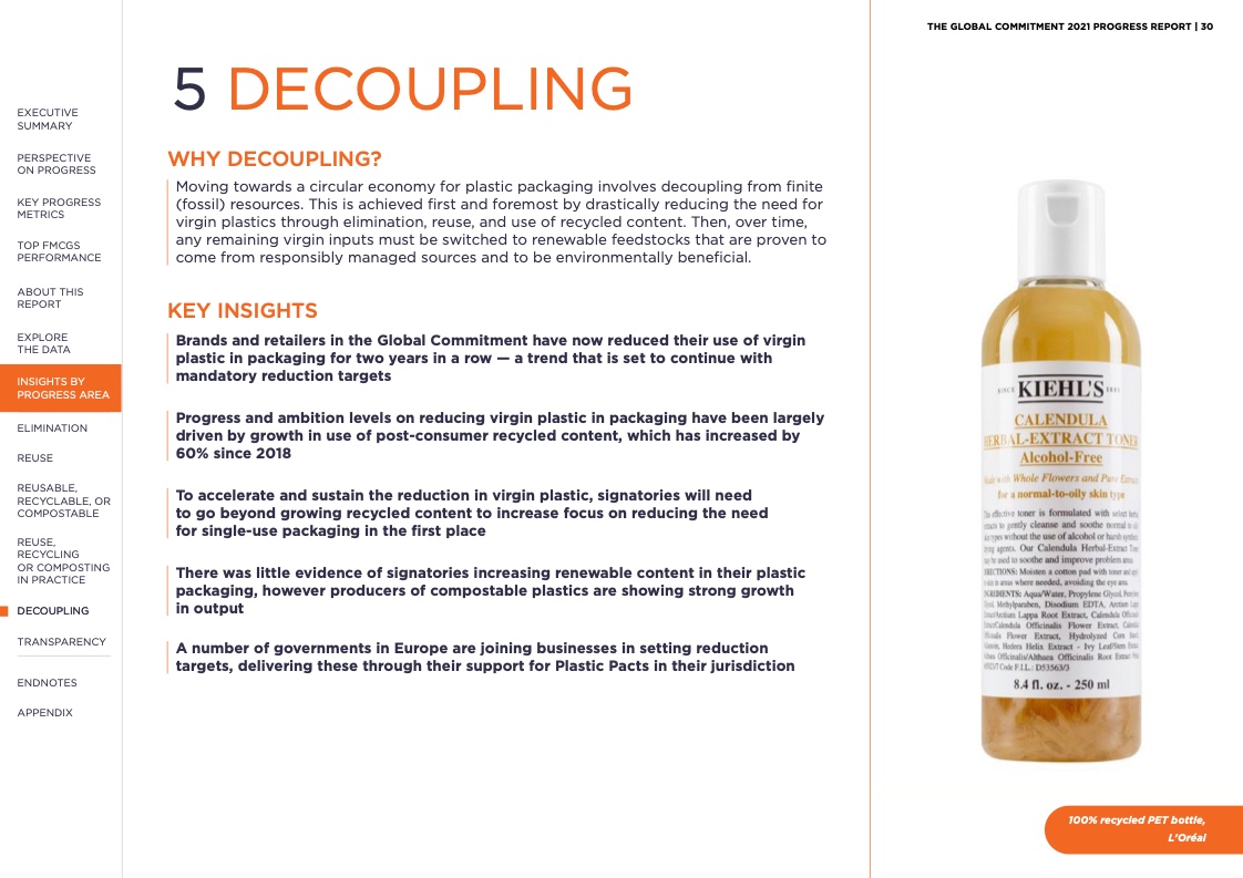 《全球承诺2020进展报告》显示,签署方在两大领域实现了显著的进展:塑料包装使用再生成分;逐渐淘汰常见的问题材料和包装,例如PS和PVC包装、无法探测到的炭黑颜料和一次性塑料袋和吸管。