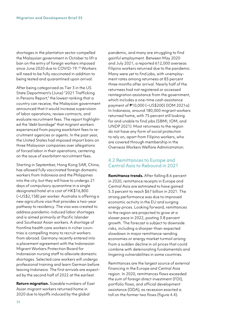 根据世界银行最新发布的《移民与发展简报》,预计2021 年低收入和中等收入国家的汇款流入额强劲增长 7.3%,达到 5890 亿美元。汇款恢复增长的势头比早先预估的更为强劲,延续了尽管因新冠疫情全球陷入严重衰退但2020 年汇款额仅下降 1.7%所展现出的韧性。
