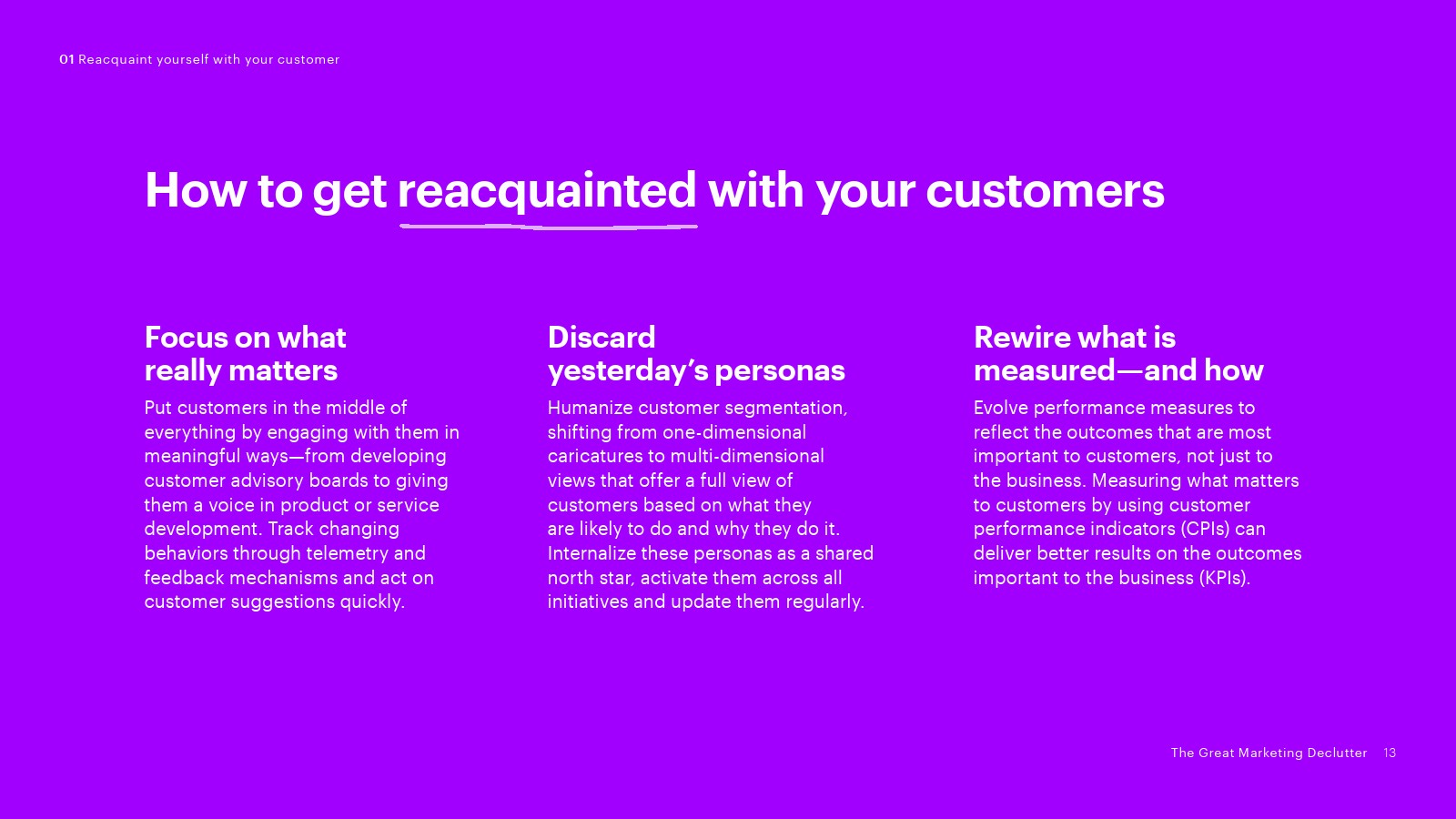 1、重新认识你的客户:接受老客户已经改变的事实,蓬勃发展者已经抛弃了他们关于客户偏好的旧观念,并且知道假设可能是危险的。
