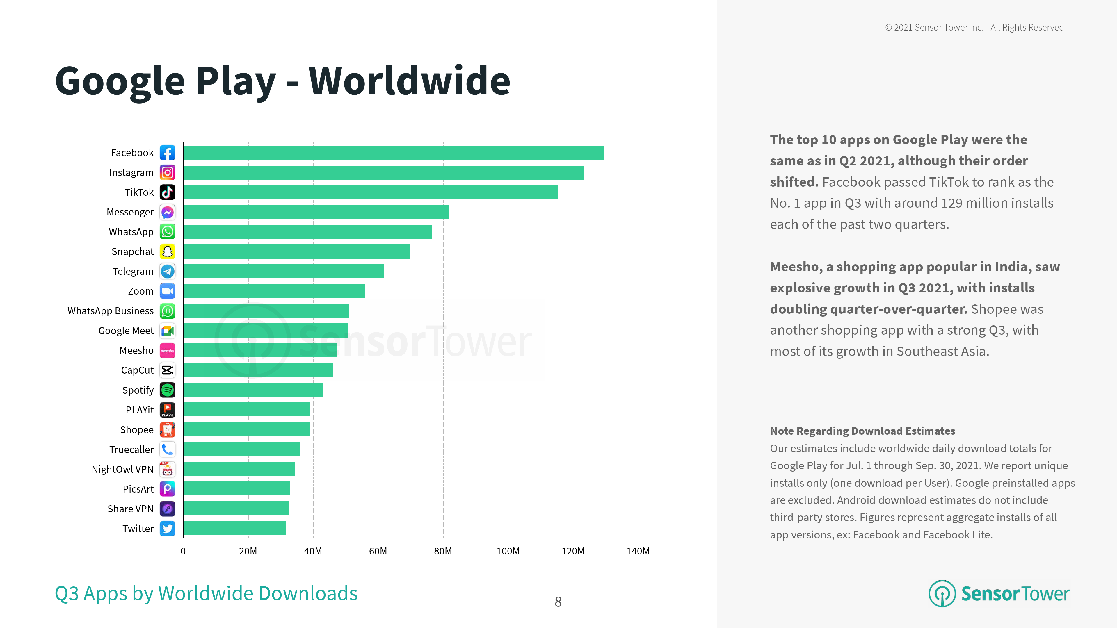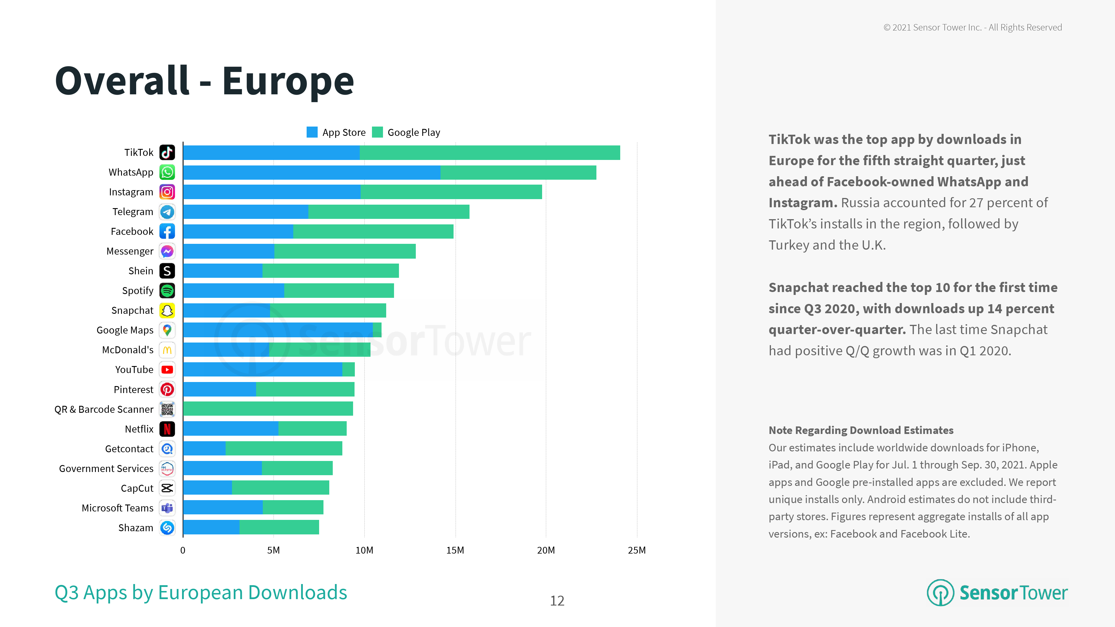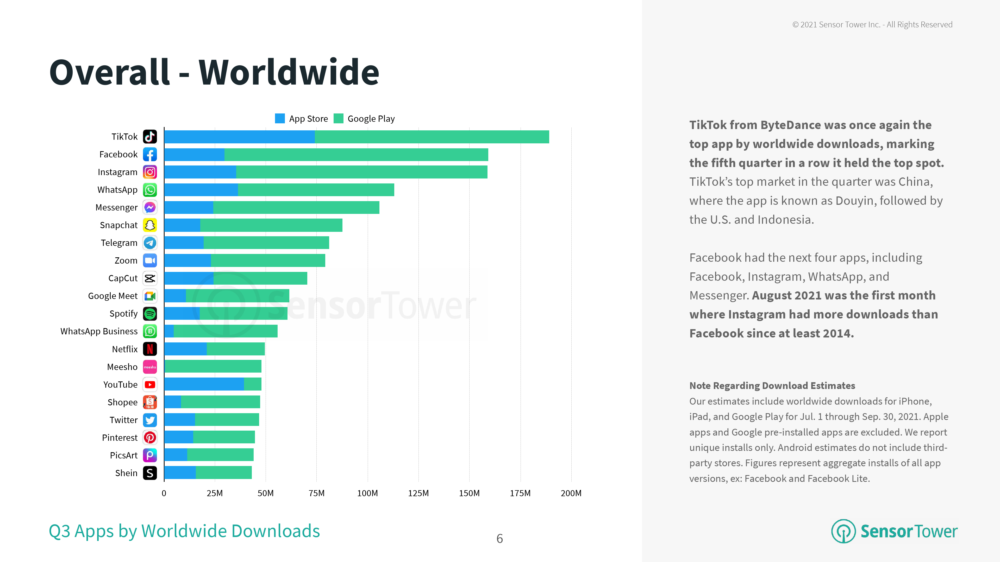 TikTok成为有史以来第五款在App Store和Google Play上下载量达到30亿次的应用。这是第一个不属于Facebook的应用程序达到了这个门槛。