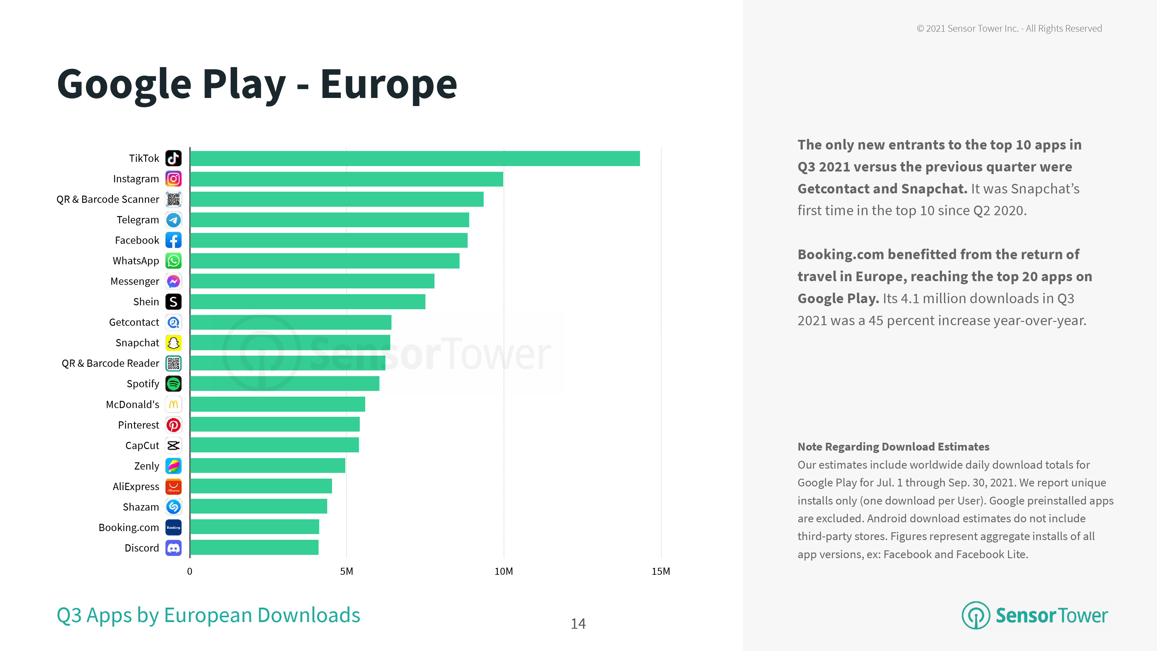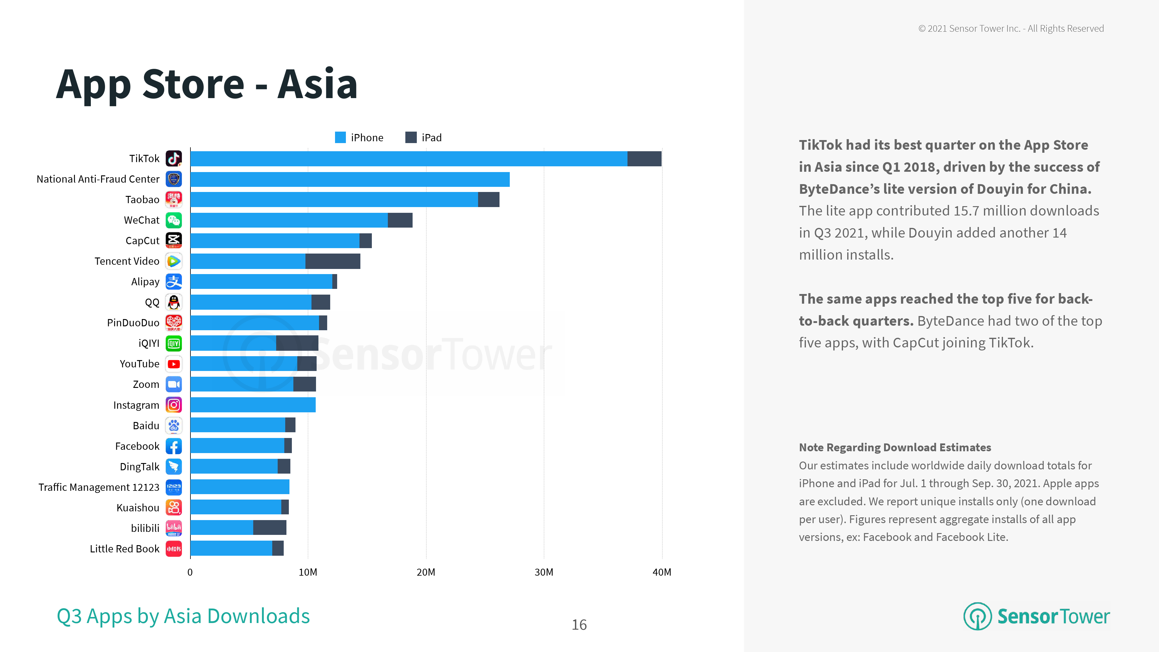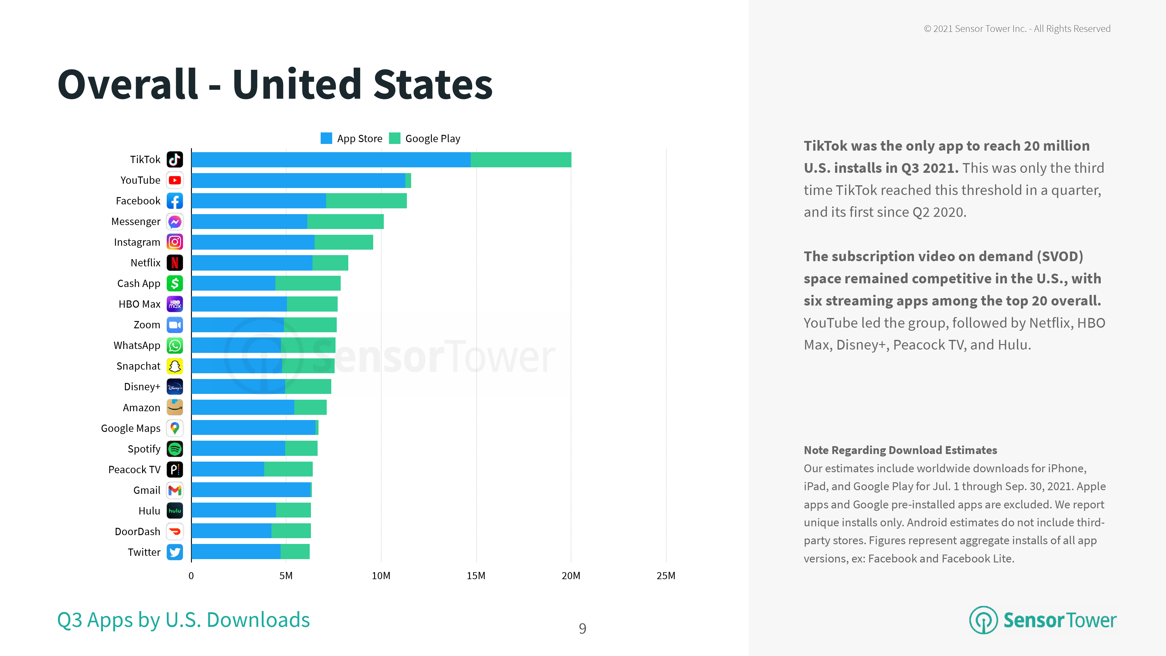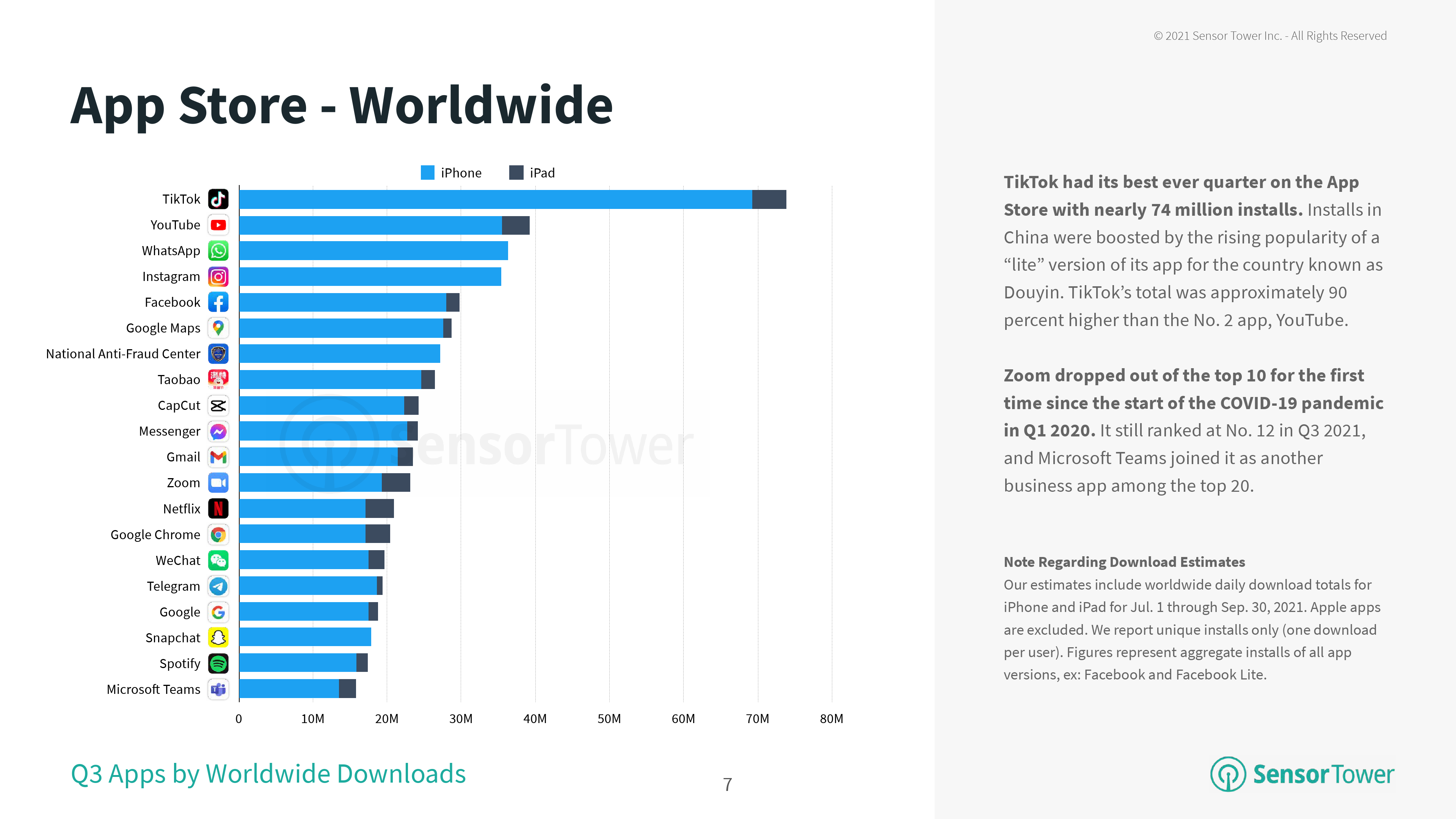 TikTok连续第五个季度位居下载量榜首,本季度最大的下载量在中国,其次是美国和印度尼西亚。第三季度App Store安装量接近7400万次。TikTok也是美国下载量最高的应用,第三季度下载2000万次。