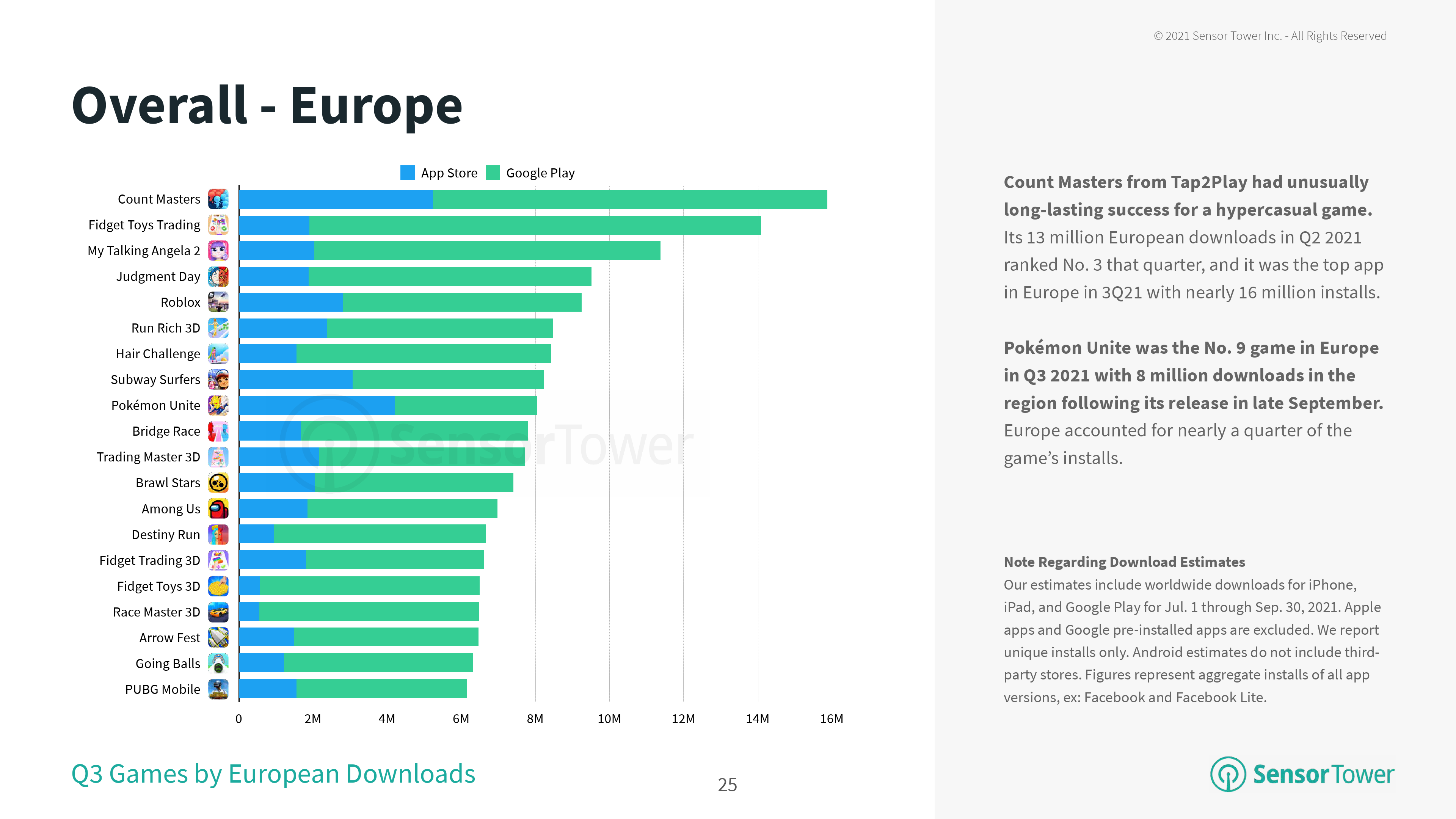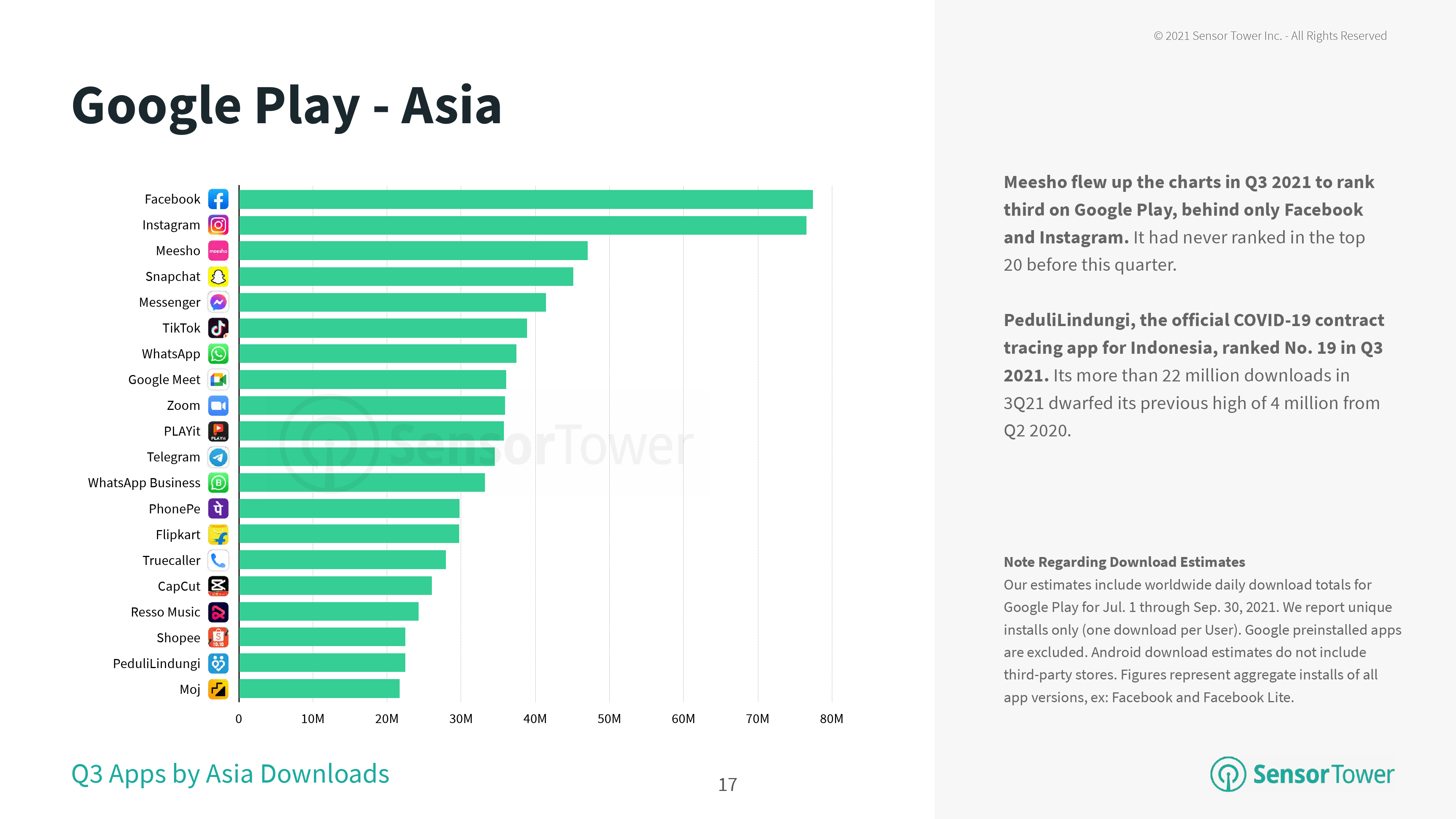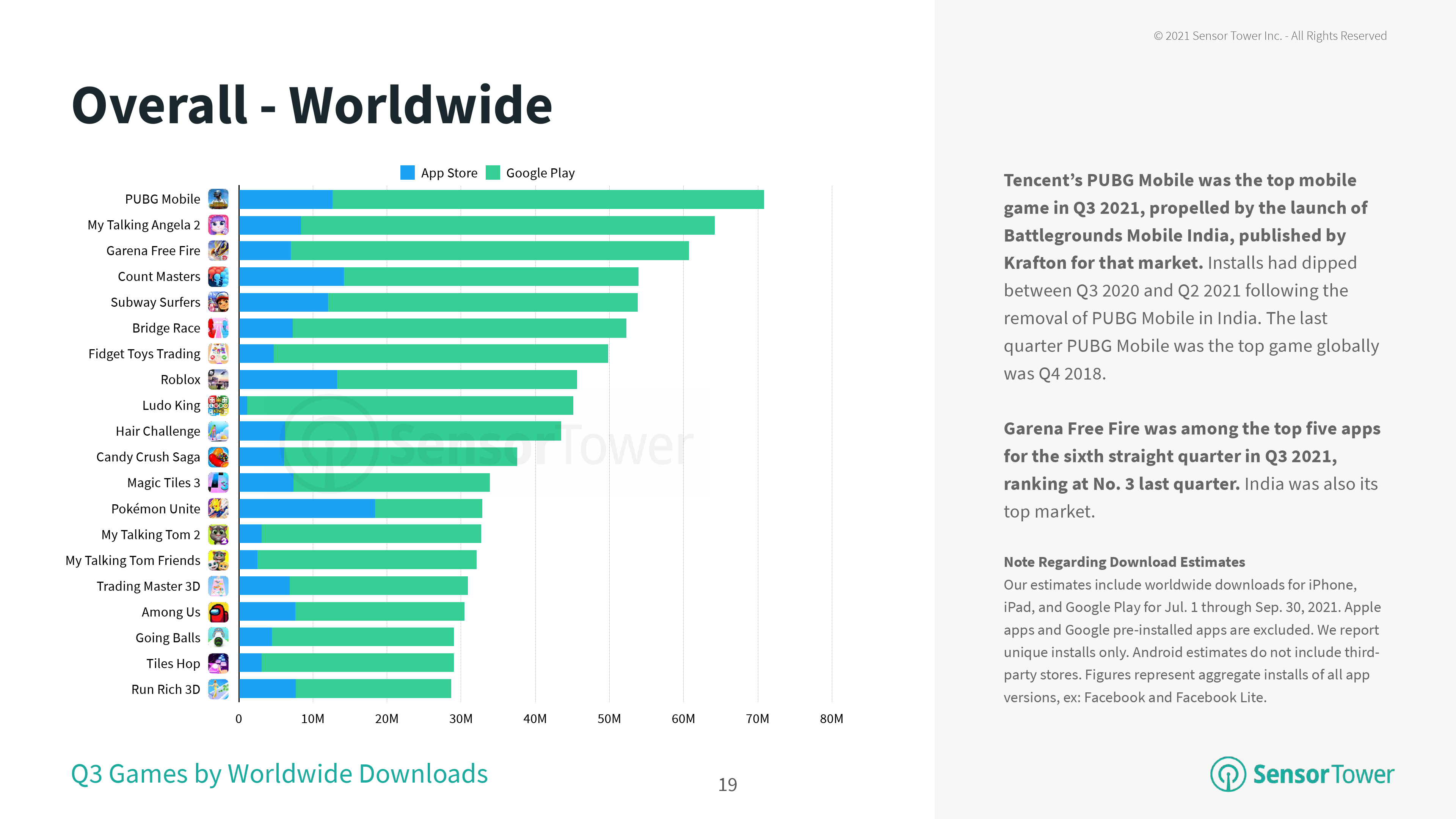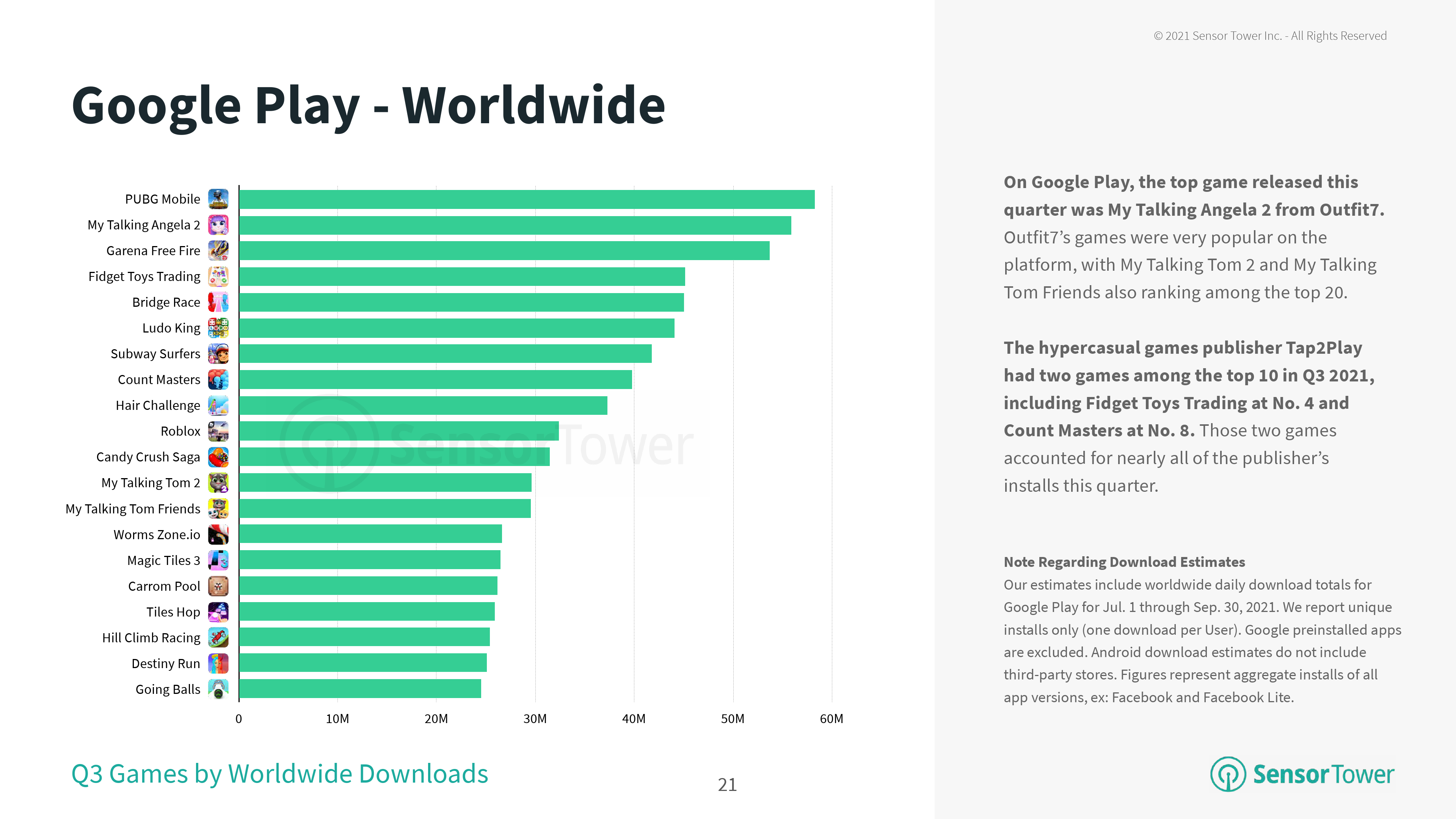 SensorTower发布了“2021年第三季度应用报告”。2021年第三季度全球应用下载总量为357亿次,比2020年第三季度新冠大流行期间的记录(364亿次)下降1.9%。App Store下载量下降1.4%,降至81亿次,而Google Play下载量下降2%,降至276亿次。