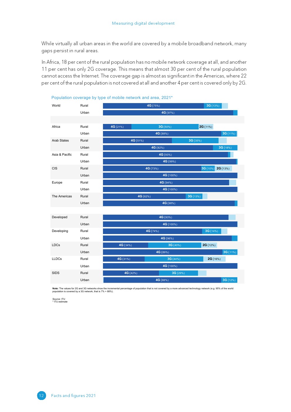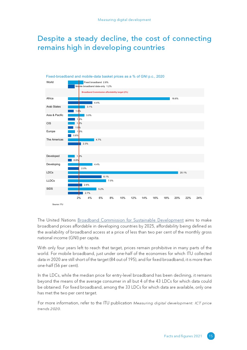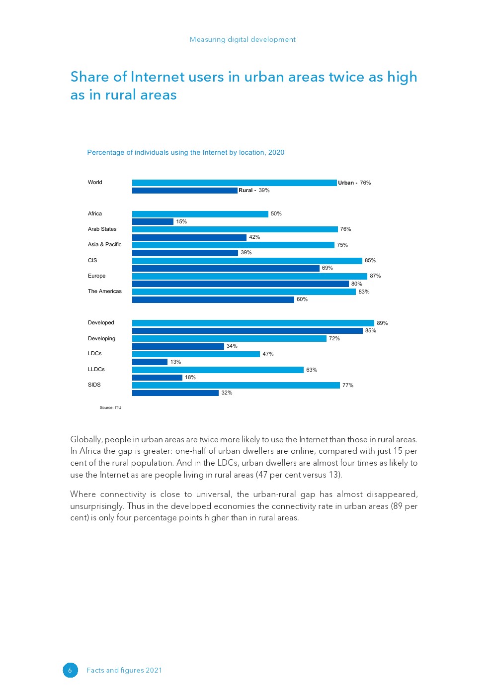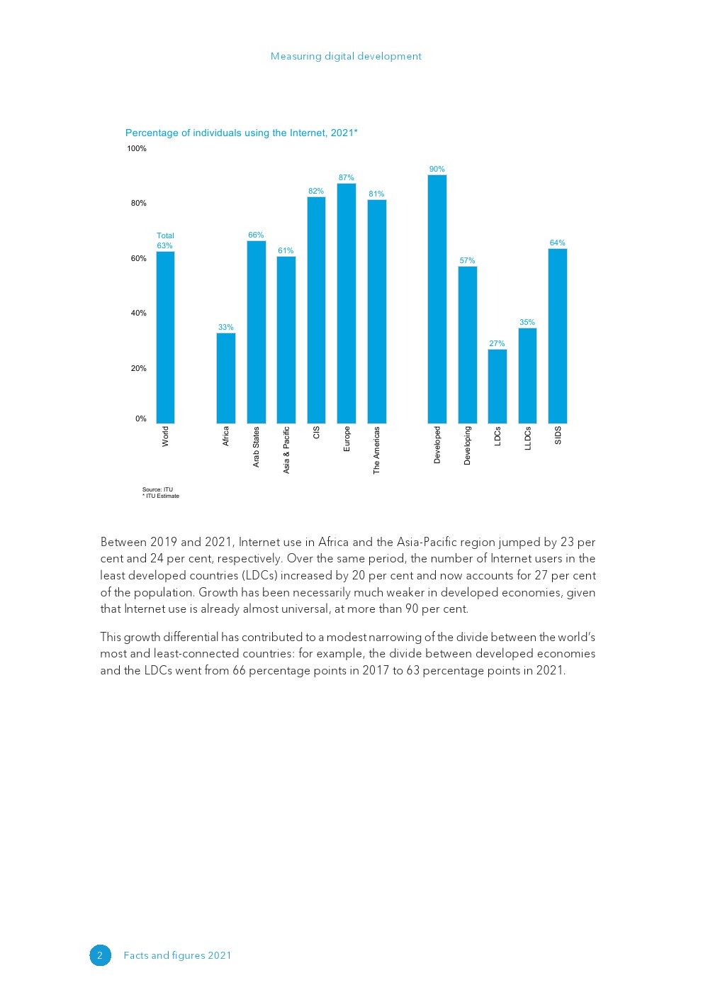 这种增长差异导致世界上联网最多和联网最少的国家之间的差距略微缩小。例如,发达经济体与最不发达国家之间的差距从2017年的66个百分点下降到2021年的63个百分点。
