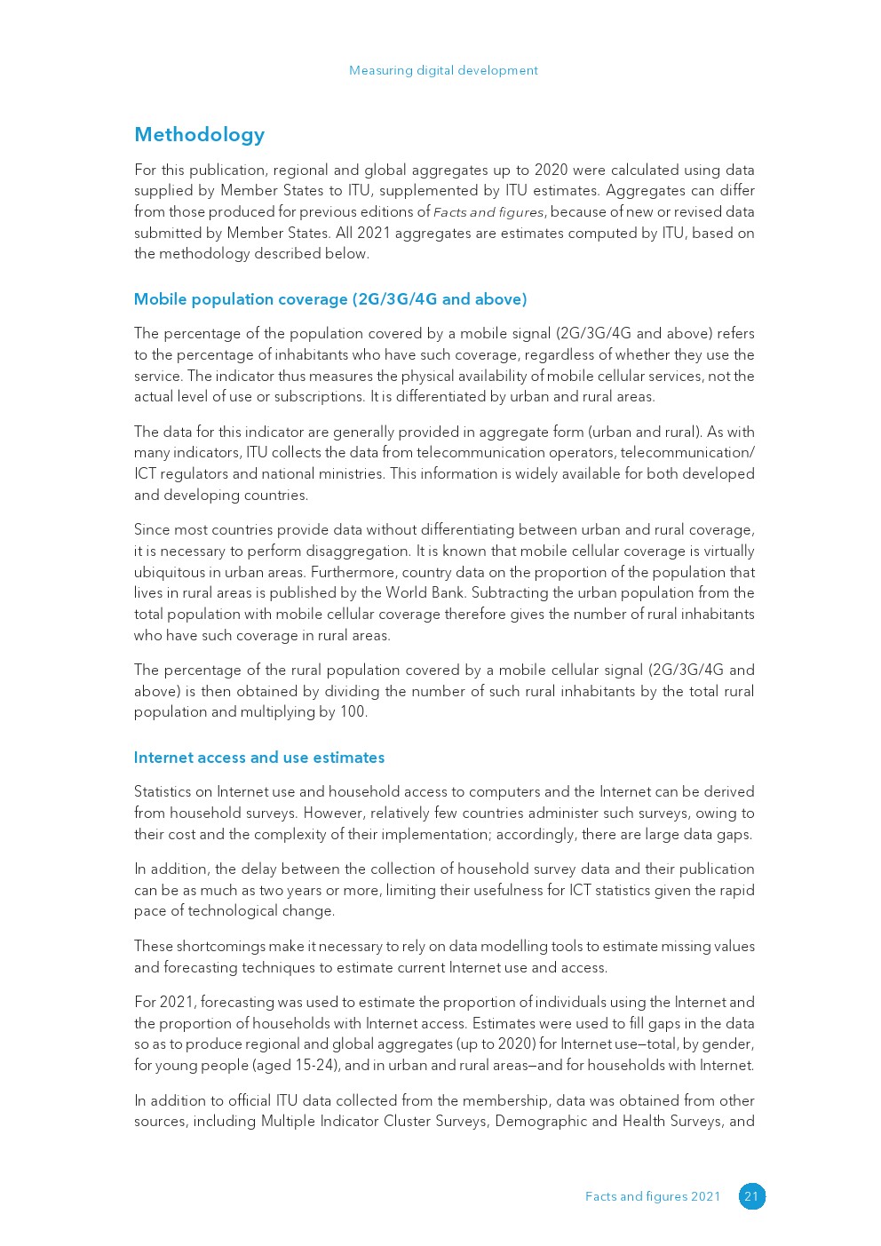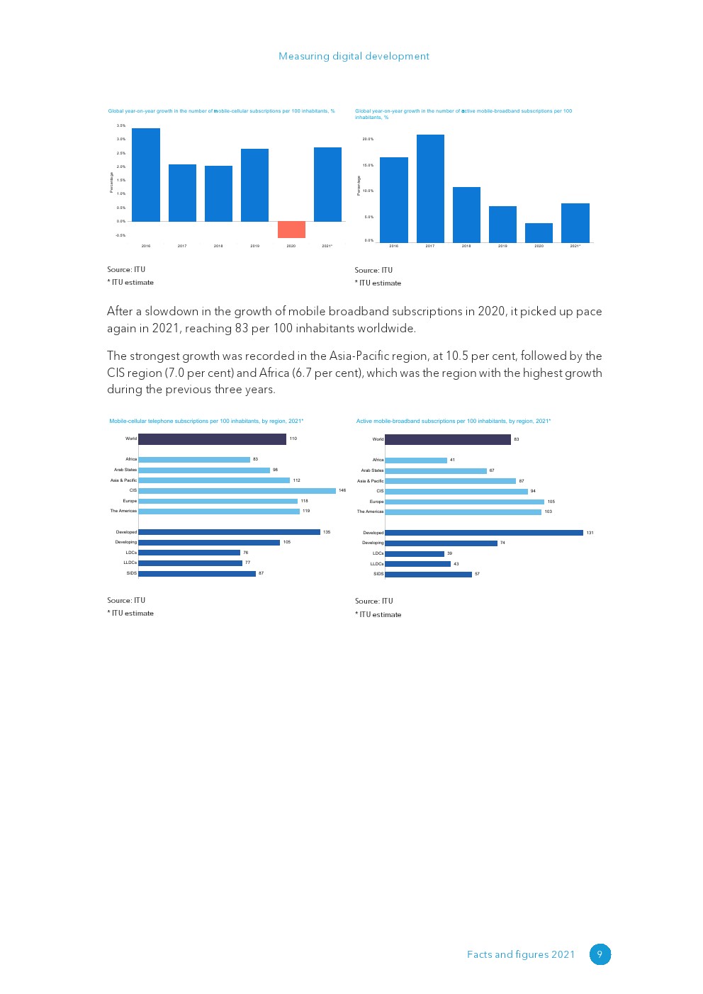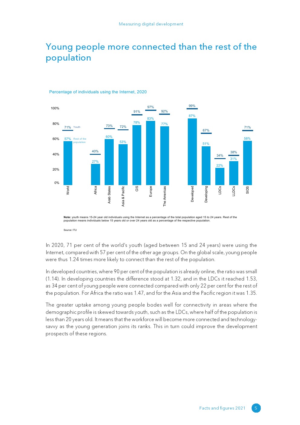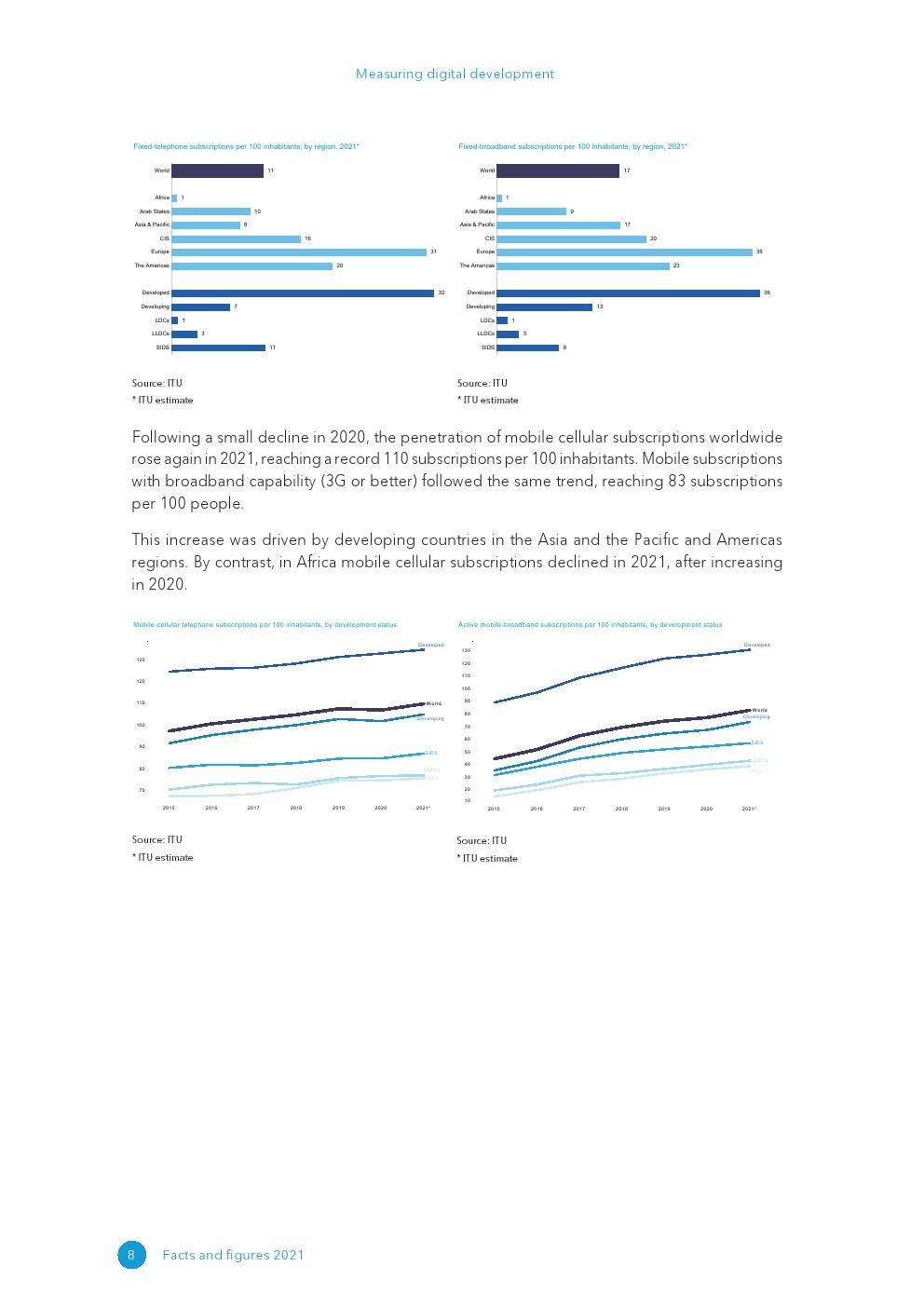 2019-2021年间,非洲和亚太地区的互联网普及分别增长了23%和24%。同一时期,最不发达国家的网民数量增长了20%,目前占人口的27%。发达经济体的增长必然要弱得多,因为互联网的普及率已经几乎达到90%以上。