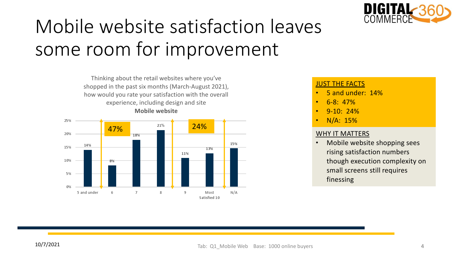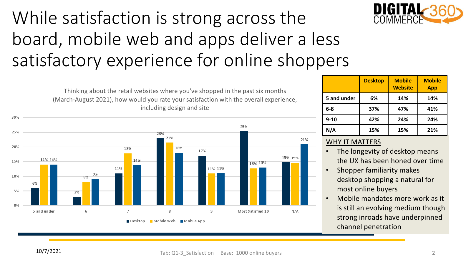 消费者对PC零售网站整体体验(包括设计和网站)的满意度最高,而对手机网站或手机应用体验的满意度则差一些。
