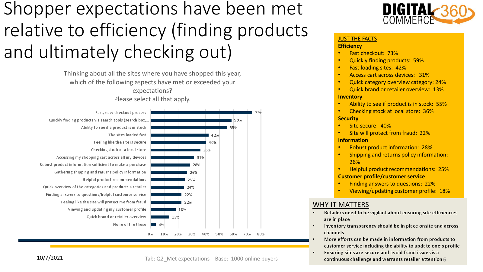 虽然零售商网站在某些方面有改进的余地,但在其他方面似乎做得很好。大多数(73%)的受访者表示,他们今年购买的网站在快速、便捷的结账流程方面达到或超过了预期。