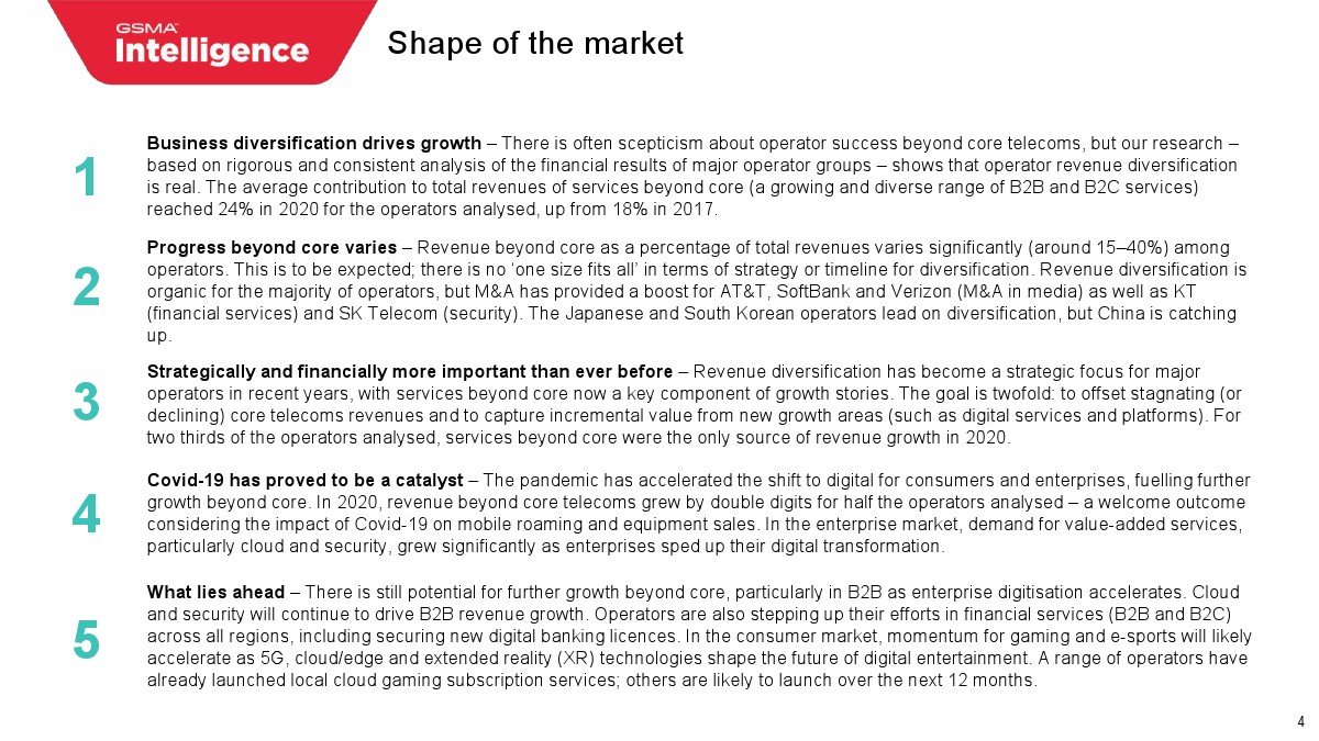 5、 未来,随着企业数字化进程的加快,在核心业务之外仍有进一步增长的潜力,特别是在B2B领域。云和安全将继续推动B2B收入增长。运营商还在所有地区加强金融服务(B2B和B2C),包括获得新的数字银行牌照。