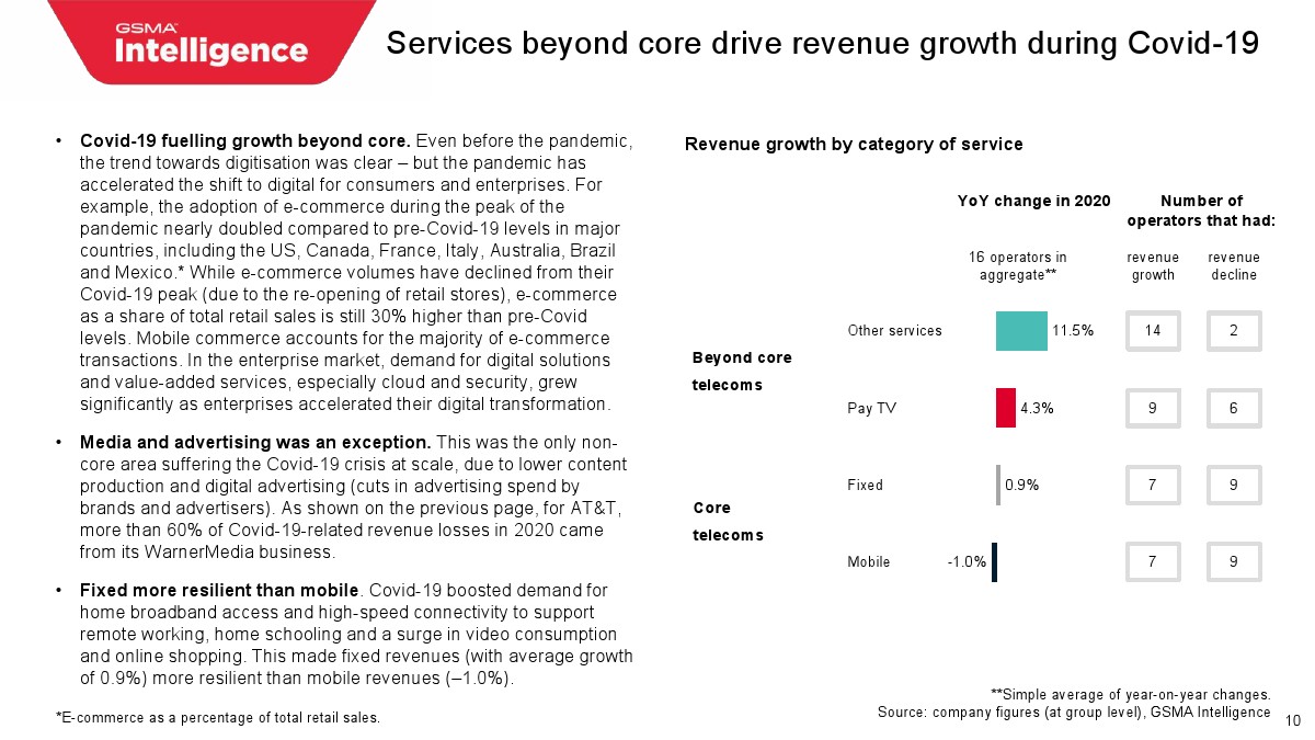 GSMA发布了“运营商收入多元化报告”,分析了Covid-19推动数字化导致核心业务外围增长仍在继续。
