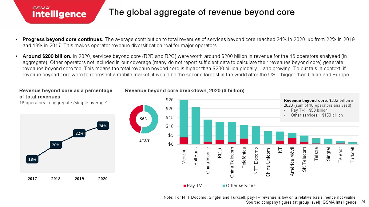 1、 业务多样化推动增长,人们通常对核心电信以外的运营商的成功持怀疑态度,但GSMA的研究表明运营商收入多样化是真实的。就所分析的运营商而言,2020年对核心以外服务总收入的平均贡献达到24%,高于2017年的18%。