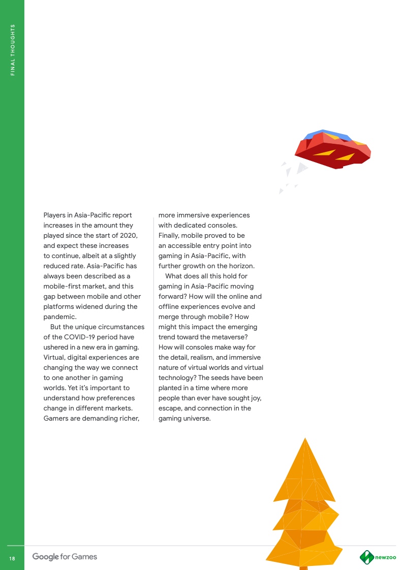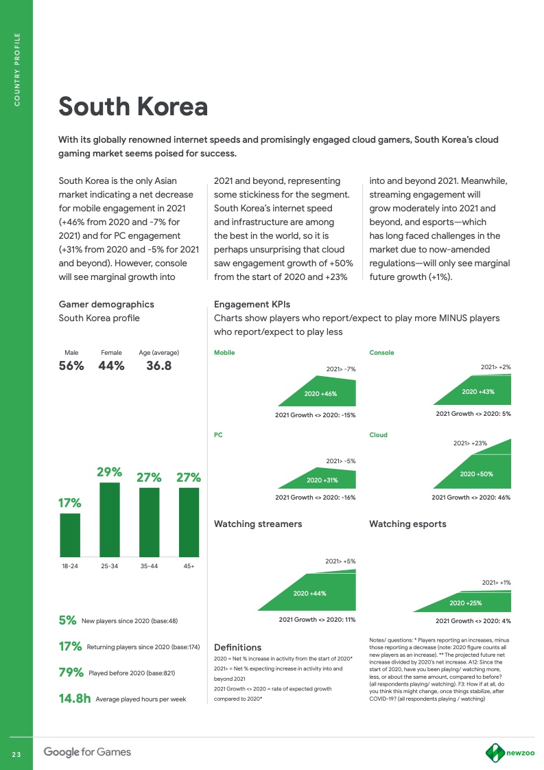 为帮助游戏行业从业者以及对游戏行业感兴趣的人,更好地了解未来全球游戏行业趋势及不同地区/市场的差异及发展动向。谷歌联合Newzoo对全球五大洲内十六个重要市场的玩家进行调研,形成了五份具有不同针对性的报告。一份针对全球游戏市场的未来整体趋势,另外四份则是对全球四个有影响力的地区的深入分析,包括北美、拉美、中东&非洲及亚洲。这一系列报告里,对会影响未来游戏行业发展的因素进行了全方位剖析,包括:玩家特征、游戏题材、商业化模式、直播内容等等。