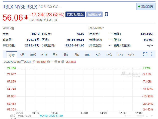 新浪科技讯 2月16日晚间消息,元宇宙概念股Roblox开盘跌超23%,创该公司美国IPO以来最大盘中跌幅,该公司2021年净亏损同比扩大近一倍至4.91亿美元。