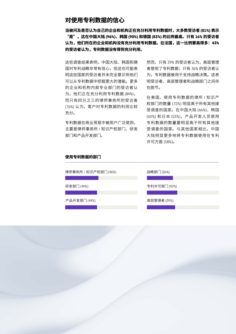 为了深入了解企业和机构如何利用专利和专利数据、所面临的的各种挑战和机遇,以及专利在推动创新生命周期方面发挥的作用,科睿唯安委托独立调查公司 Vitreous World 对全球主要国家和地区的专利趋势进行了研究。研究征求了七个国家/地区(美国、英国、法国、德国、中国大陆、日本和韩国)的 275 名知识产权和专利专业人士的意见,包括企业和机构内部法律顾问和外部律师。