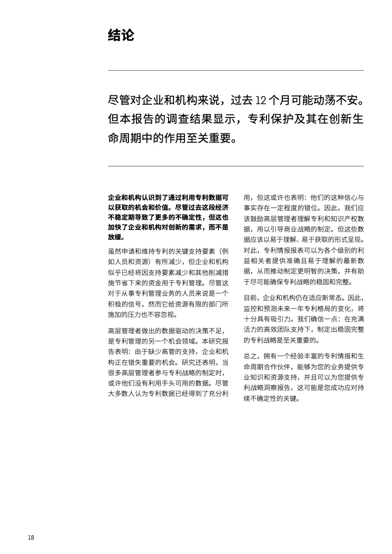 世界各地的企业和机构都在一个存在着持续性冲击风险的环境中运营。竞争格局瞬息万变,机会也时刻出现在我们意想不到的地方。在这个创新的时代,知识产权是商业要务的核心——尤其是现在,专利代表着竞争优势、市场份额、许可、合作伙伴关系、投资者等方方面面的机会。